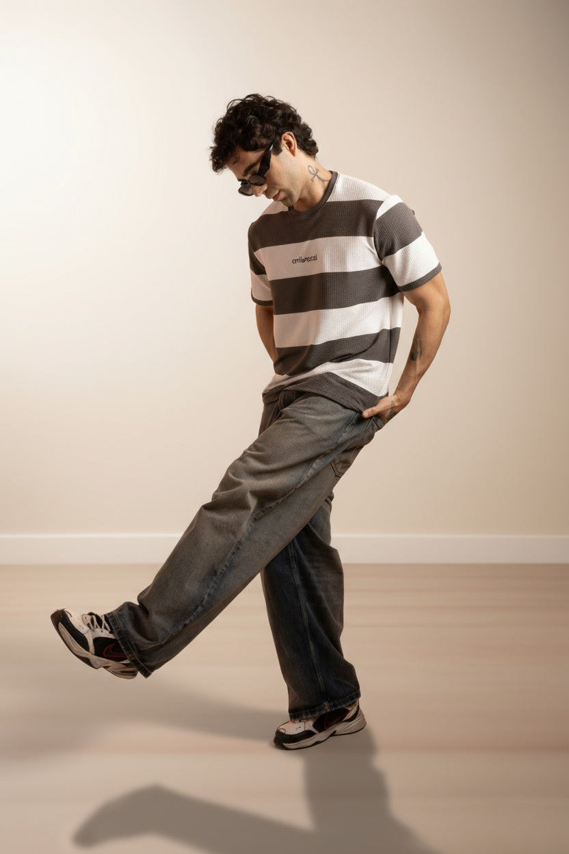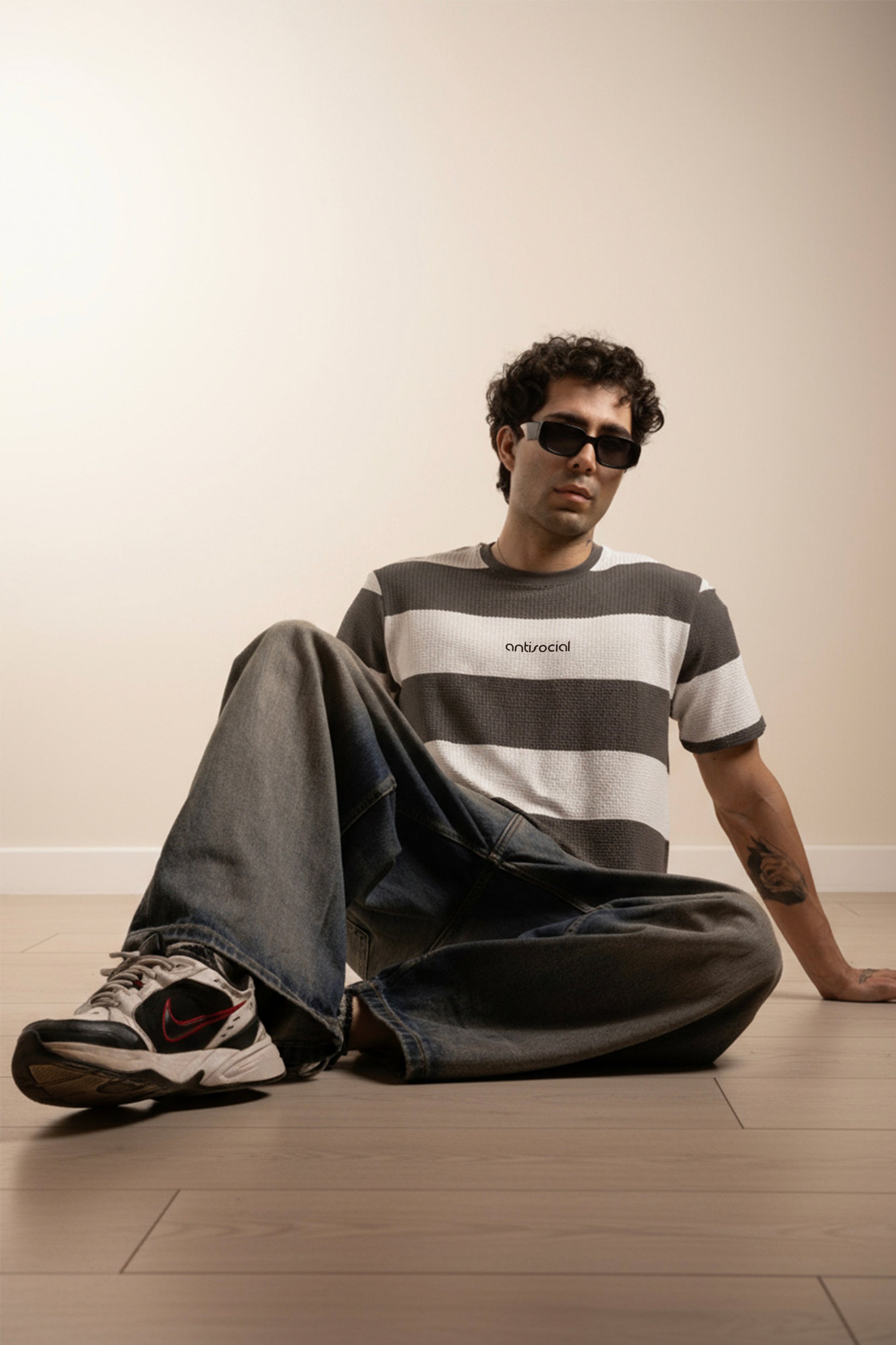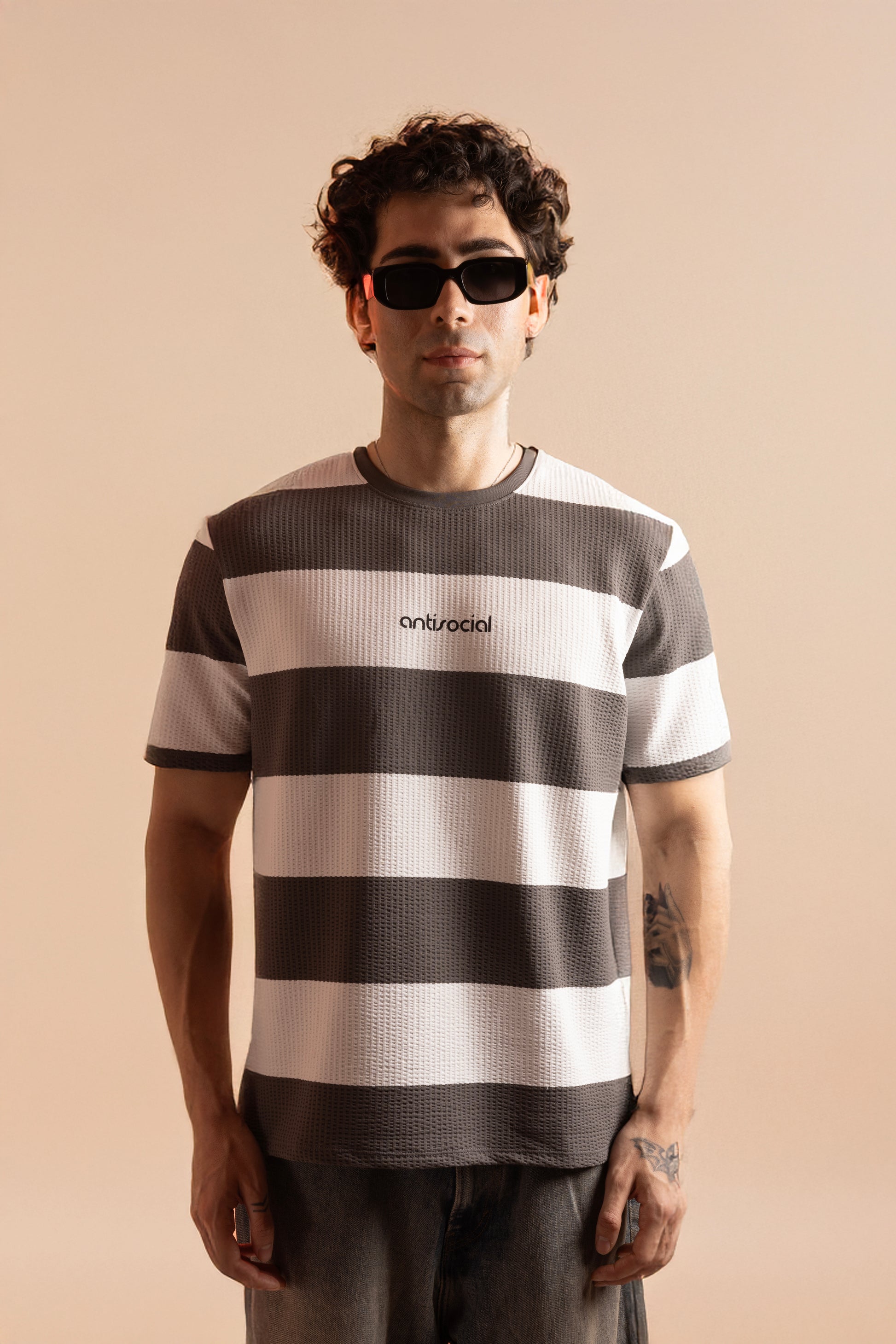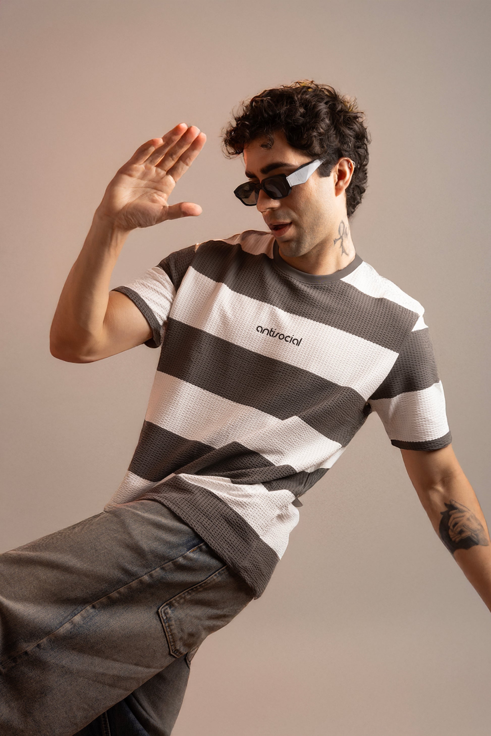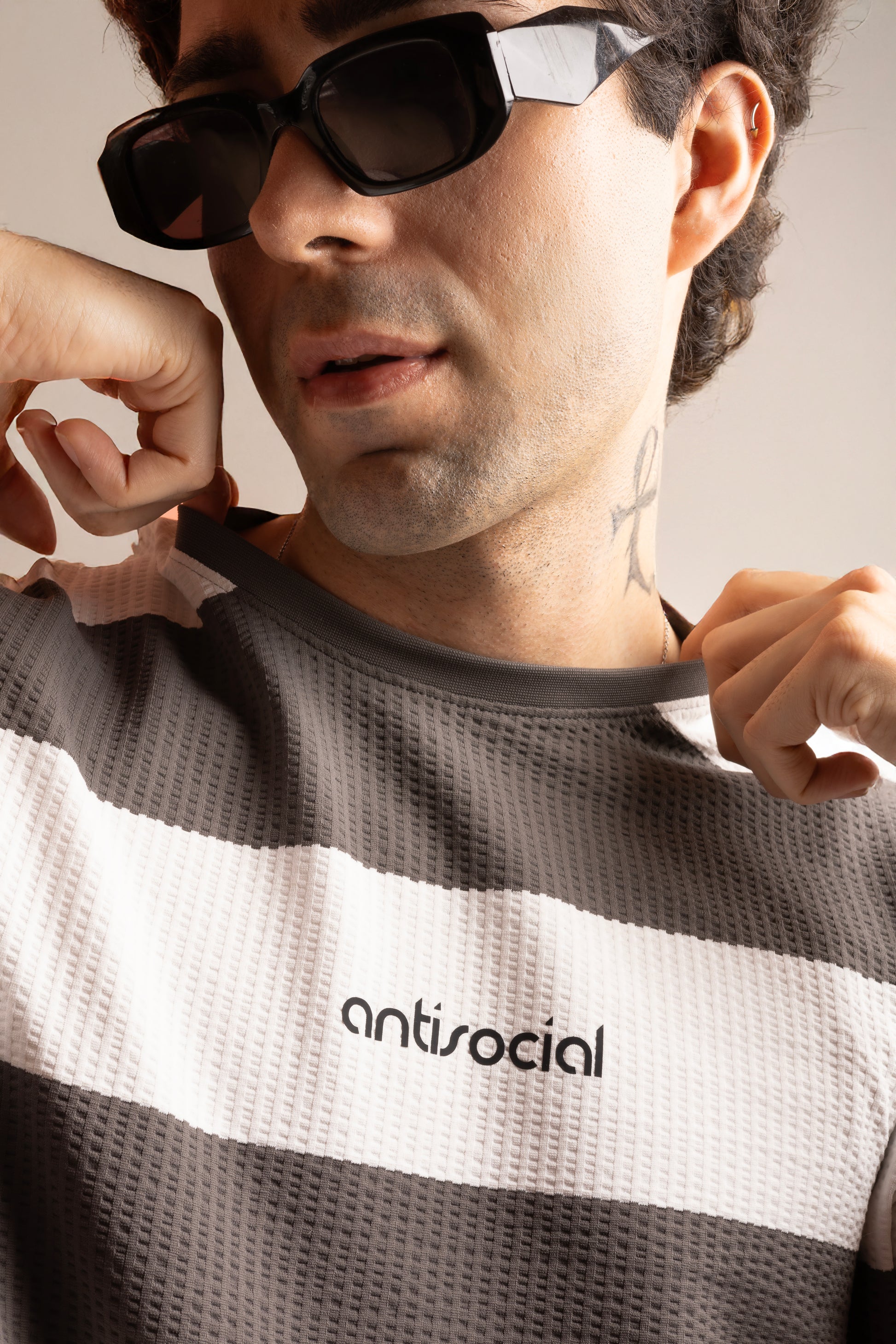 Featuring a bold chest print of ‘Anti Social’, this 50/50 striped crew neck tee is crafted from premium Seer Sucker Lycra Autostriper fabric, giving it a textured, stretchable, and breathable fit for all-day comfort.