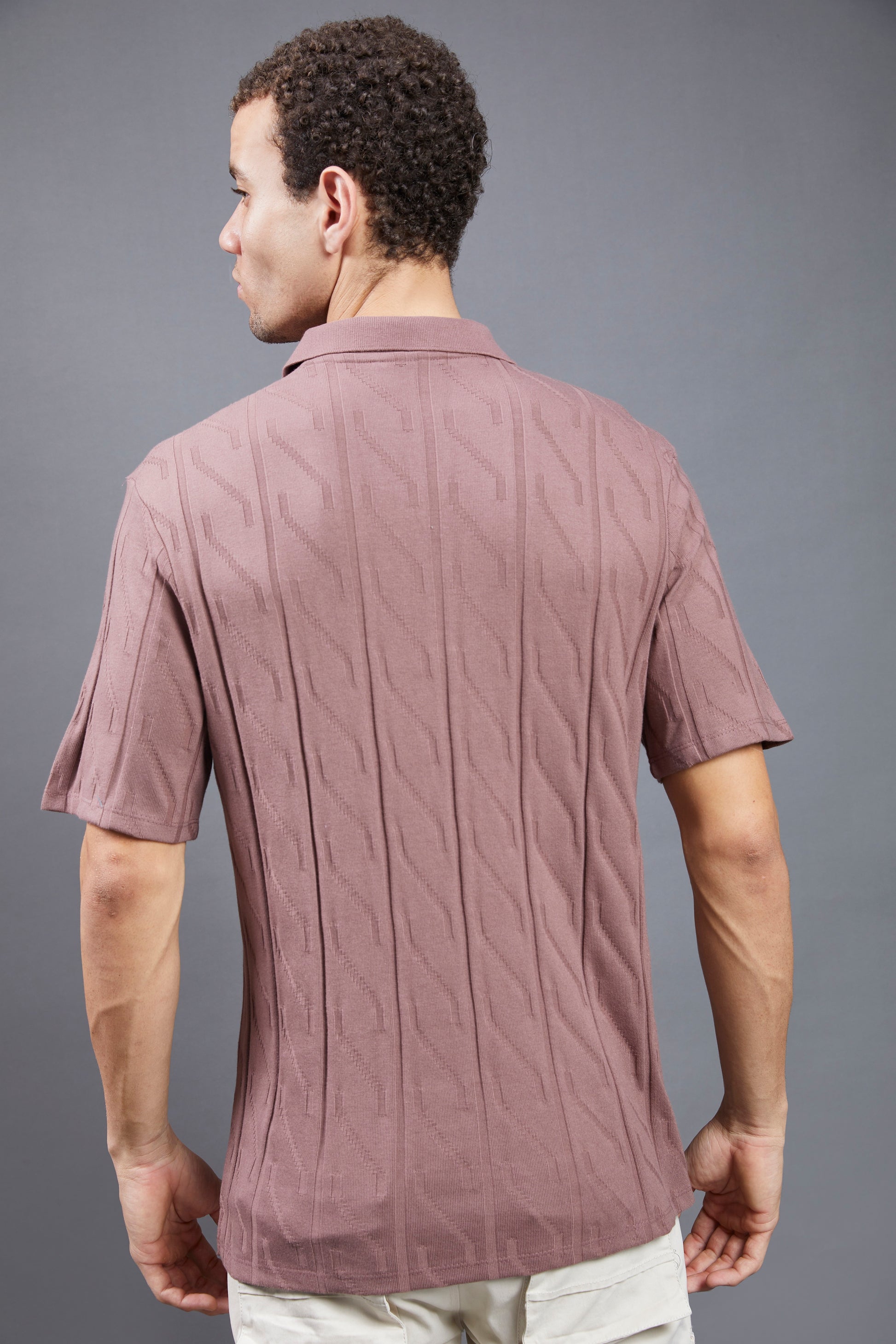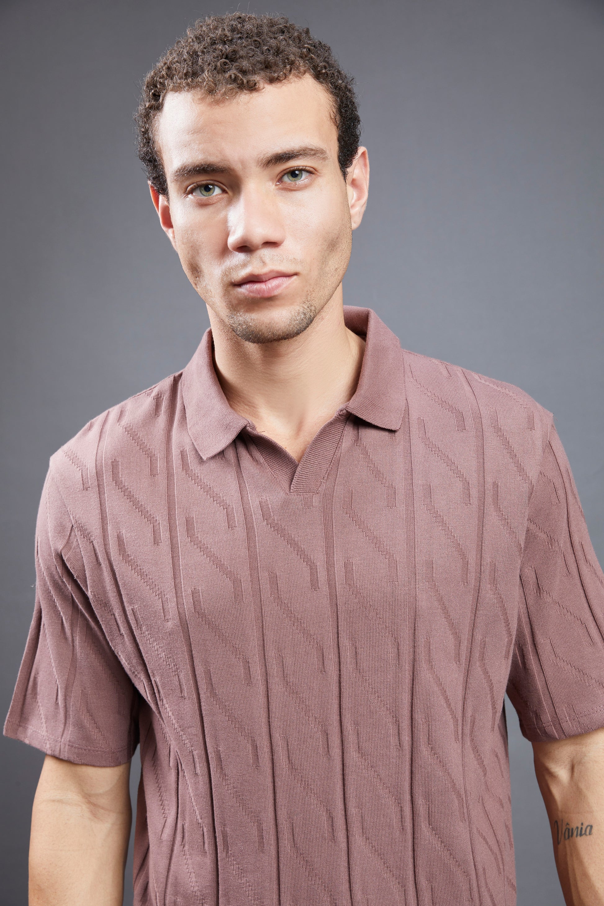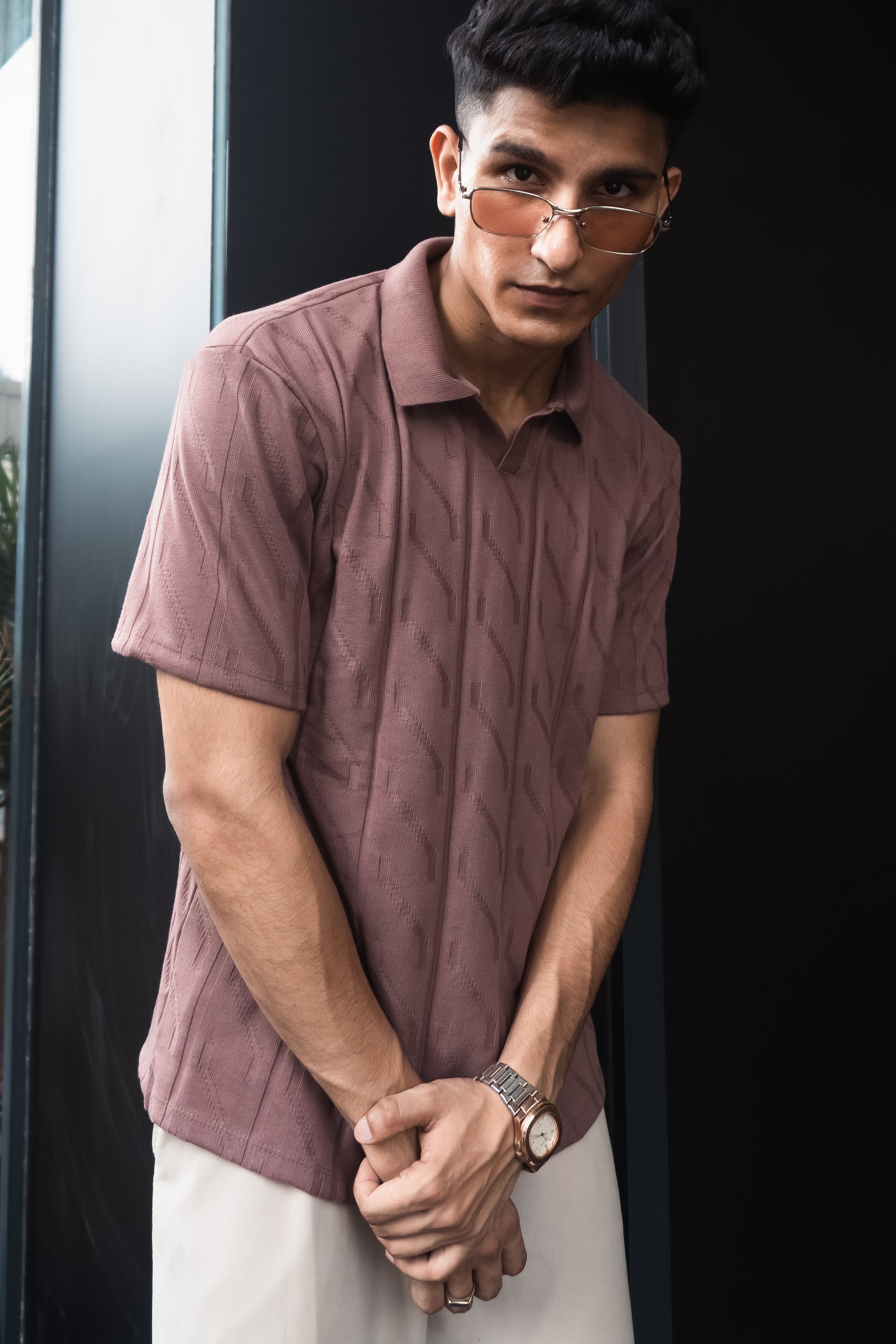 A dusty mauve knit polo with an embossed zigzag line motif that flows like circuits on fabric. Designed for those who love texture over noise — this piece quietly commands attention. Tailored yet relaxed, it's a reminder that even the most intricate paths can look effortless when you're in your element.