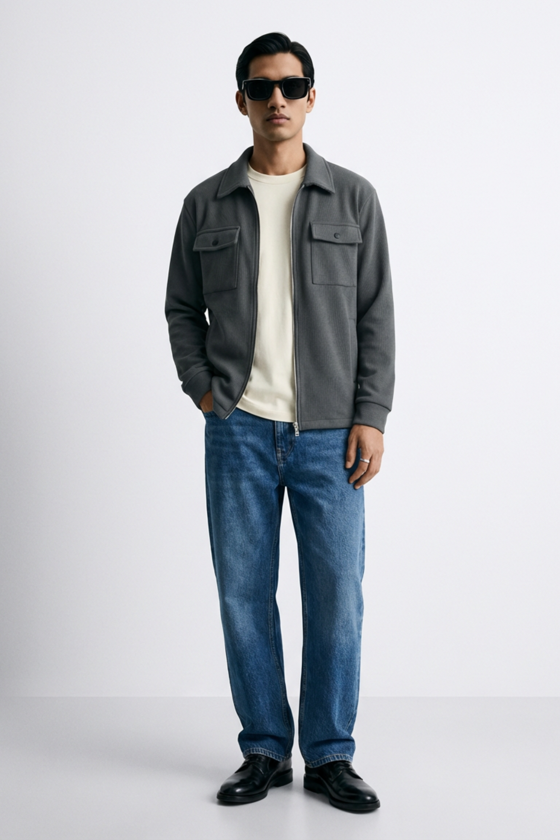 - Classic shirt-style collar with a clean full-length zipper