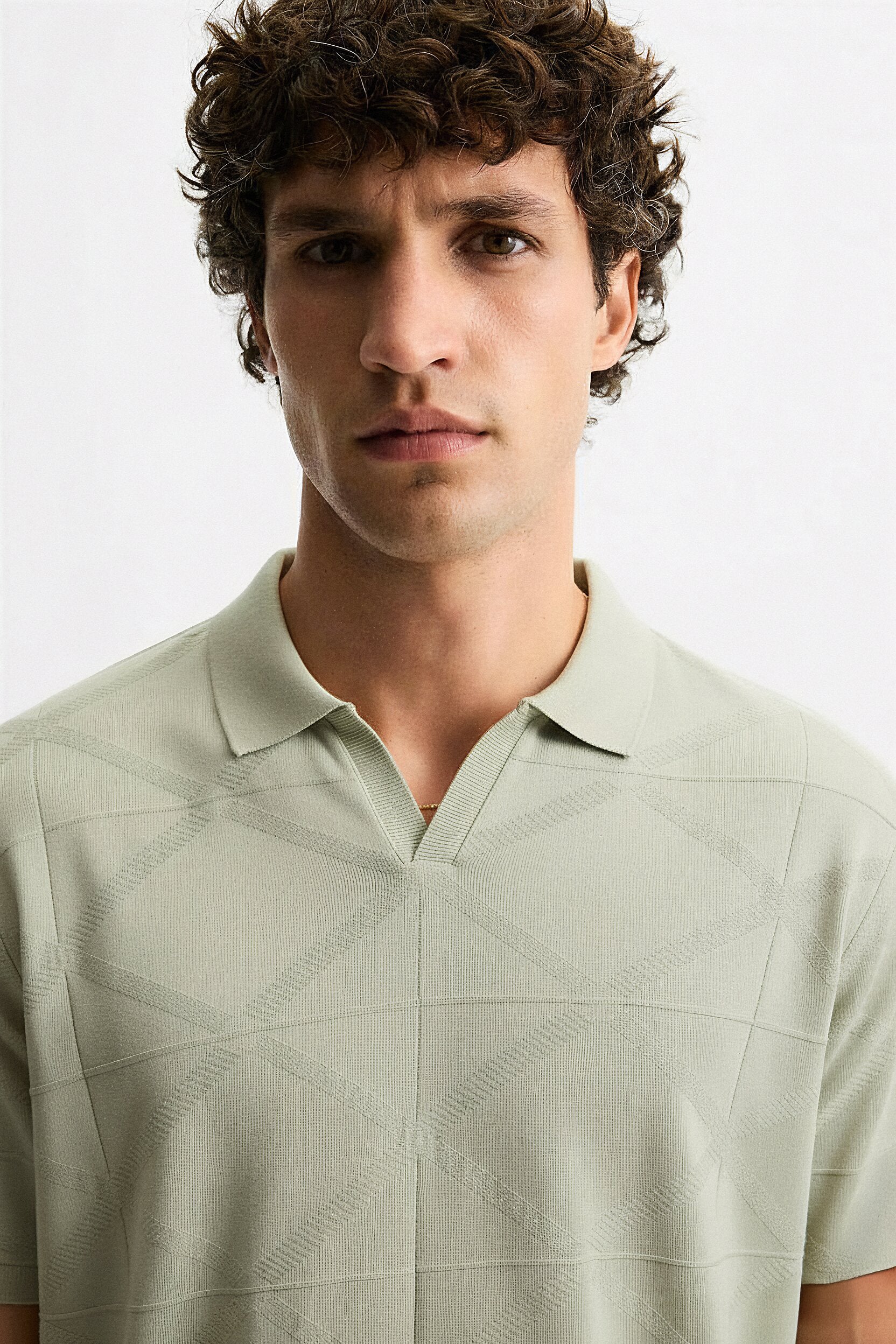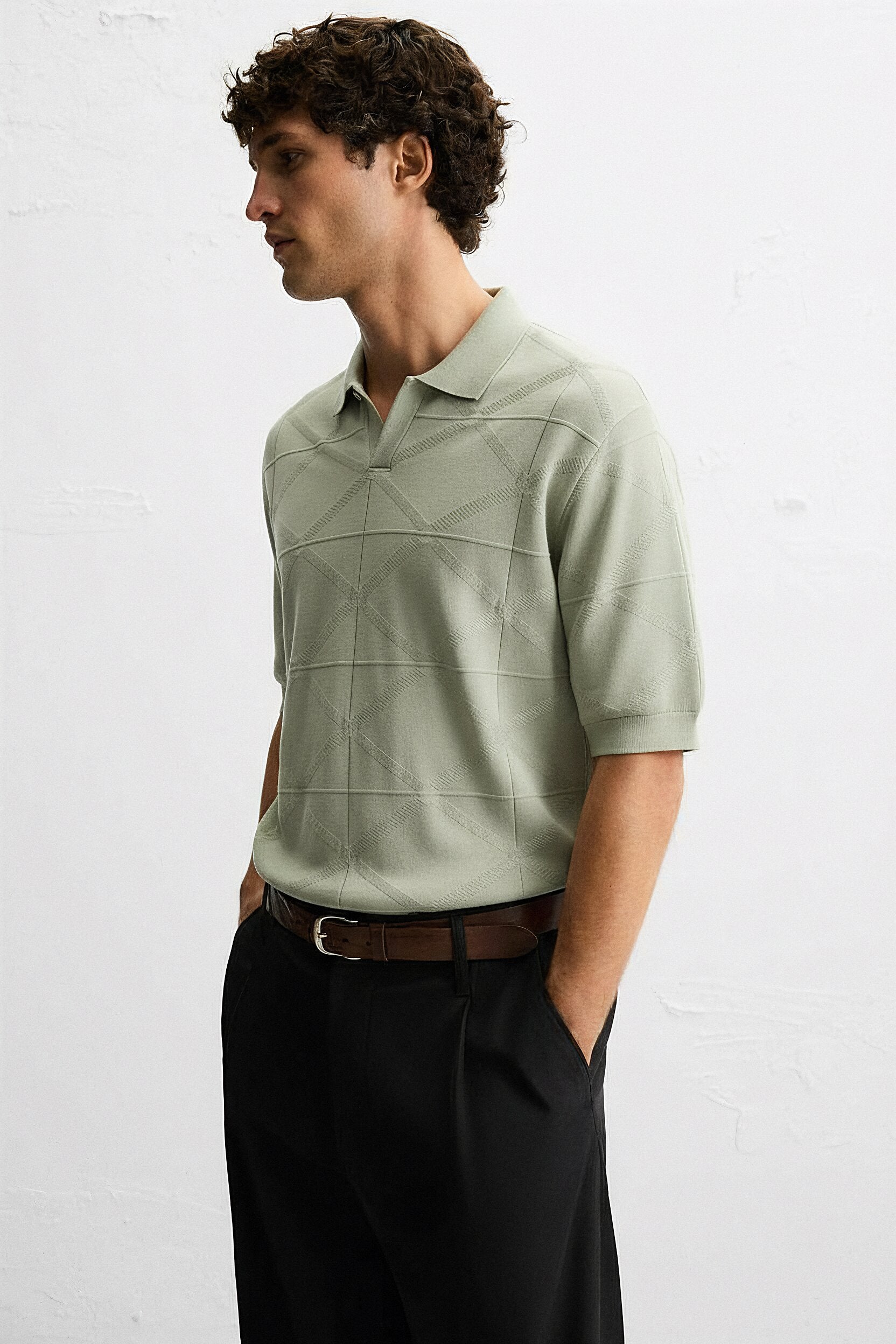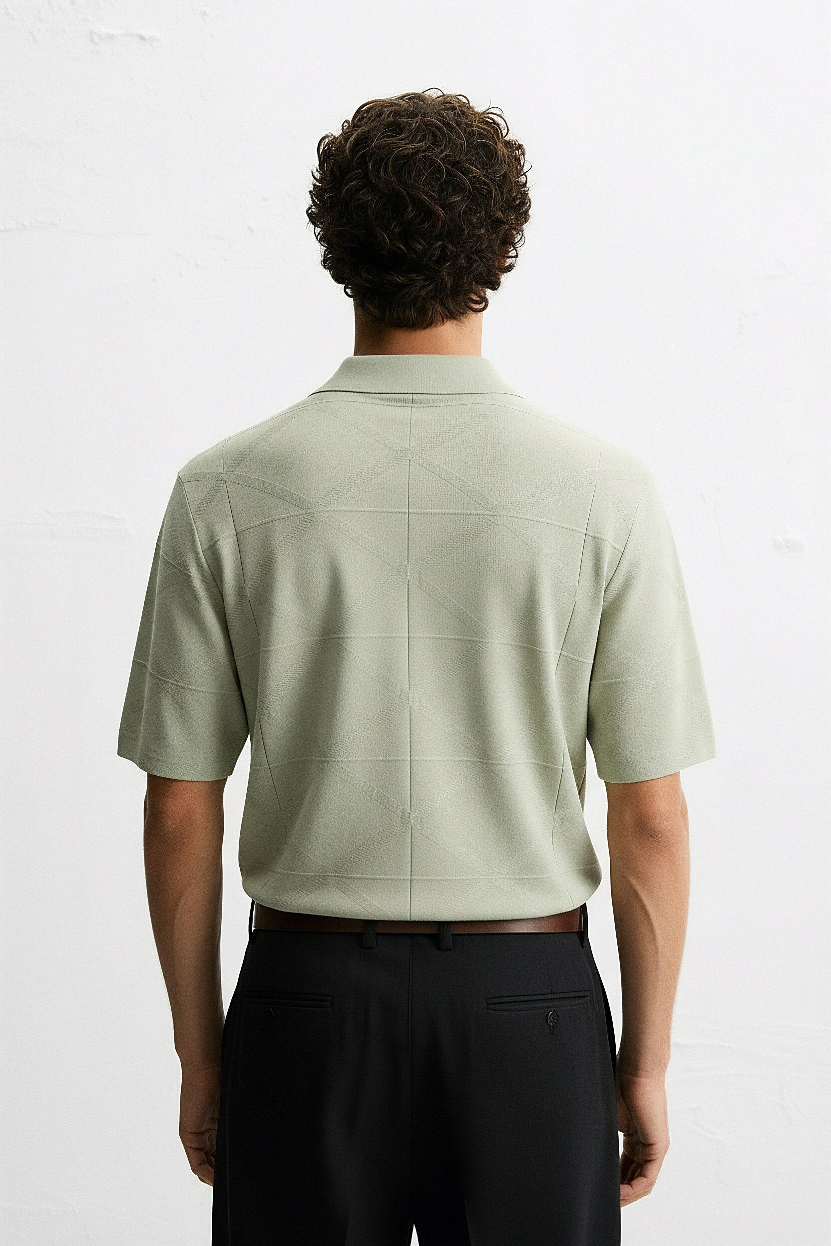 A polo that’s anything but conventional. The sage green hue meets a crisp, oversized grid pattern intricately knitted into the fabric — giving it an architectural edge. Made for those who see structure in chaos and clarity in boldness. A conversation starter without uttering a word.