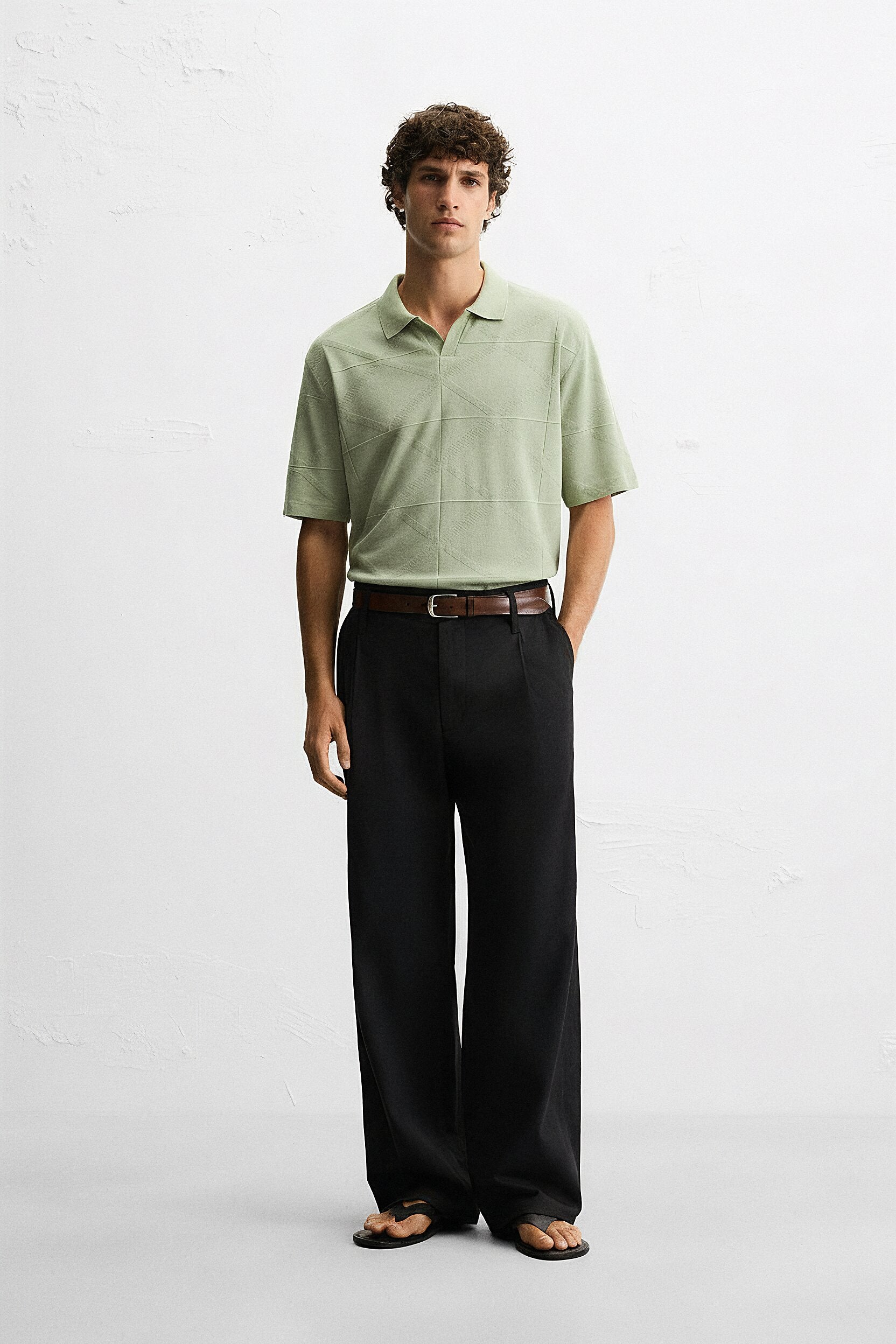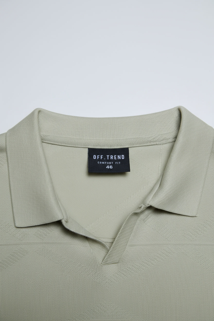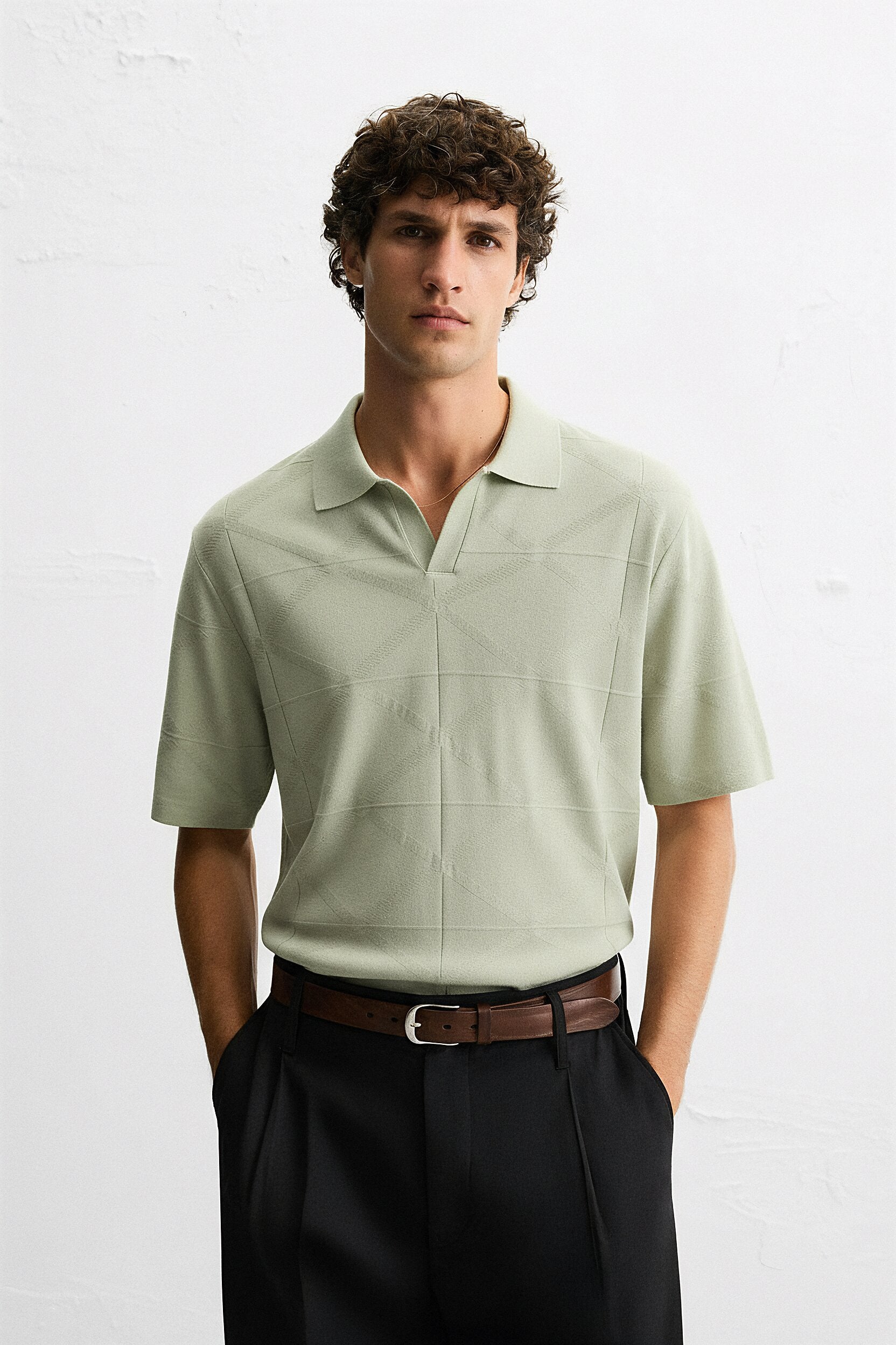 A polo that’s anything but conventional. The sage green hue meets a crisp, oversized grid pattern intricately knitted into the fabric — giving it an architectural edge. Made for those who see structure in chaos and clarity in boldness. A conversation starter without uttering a word.
