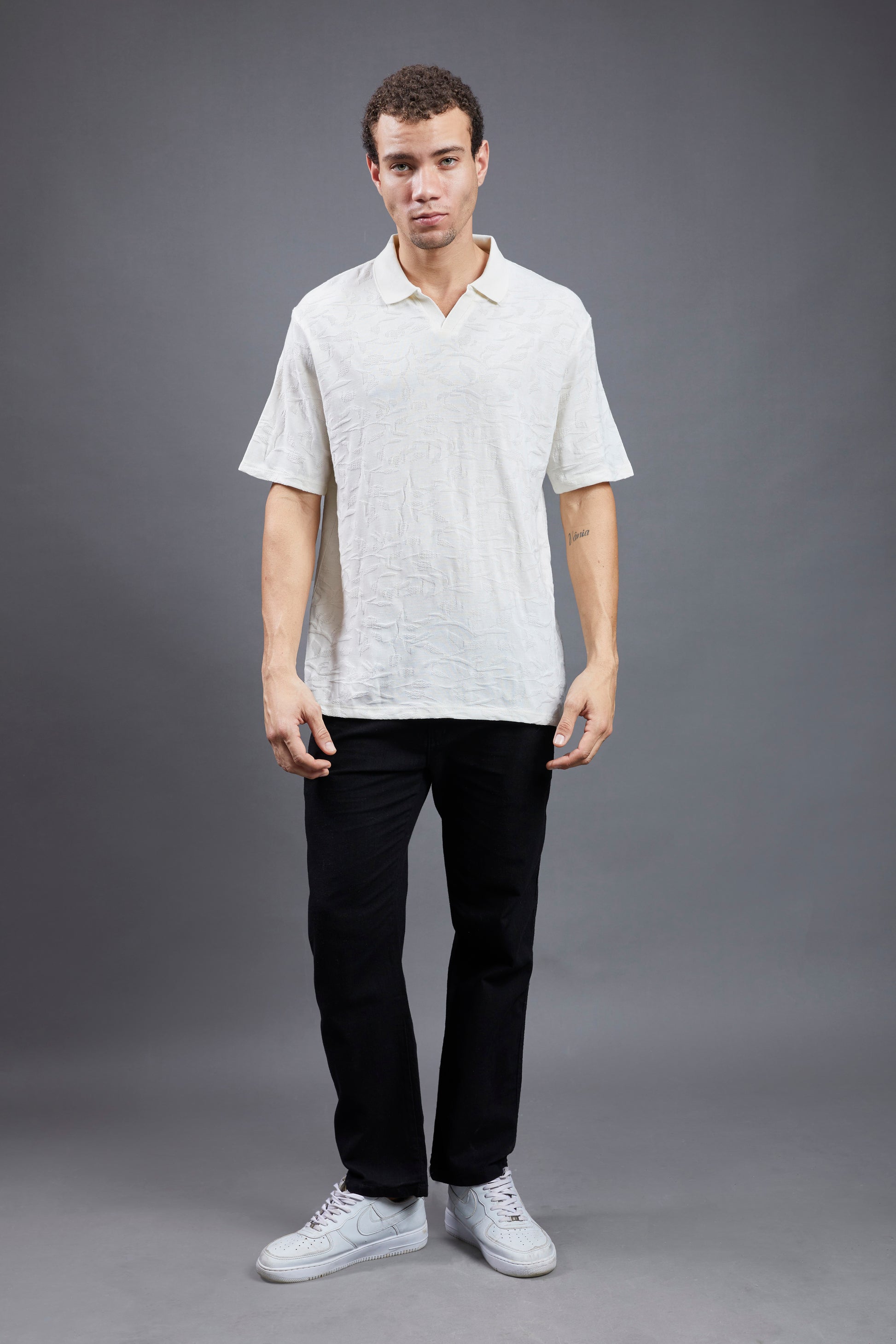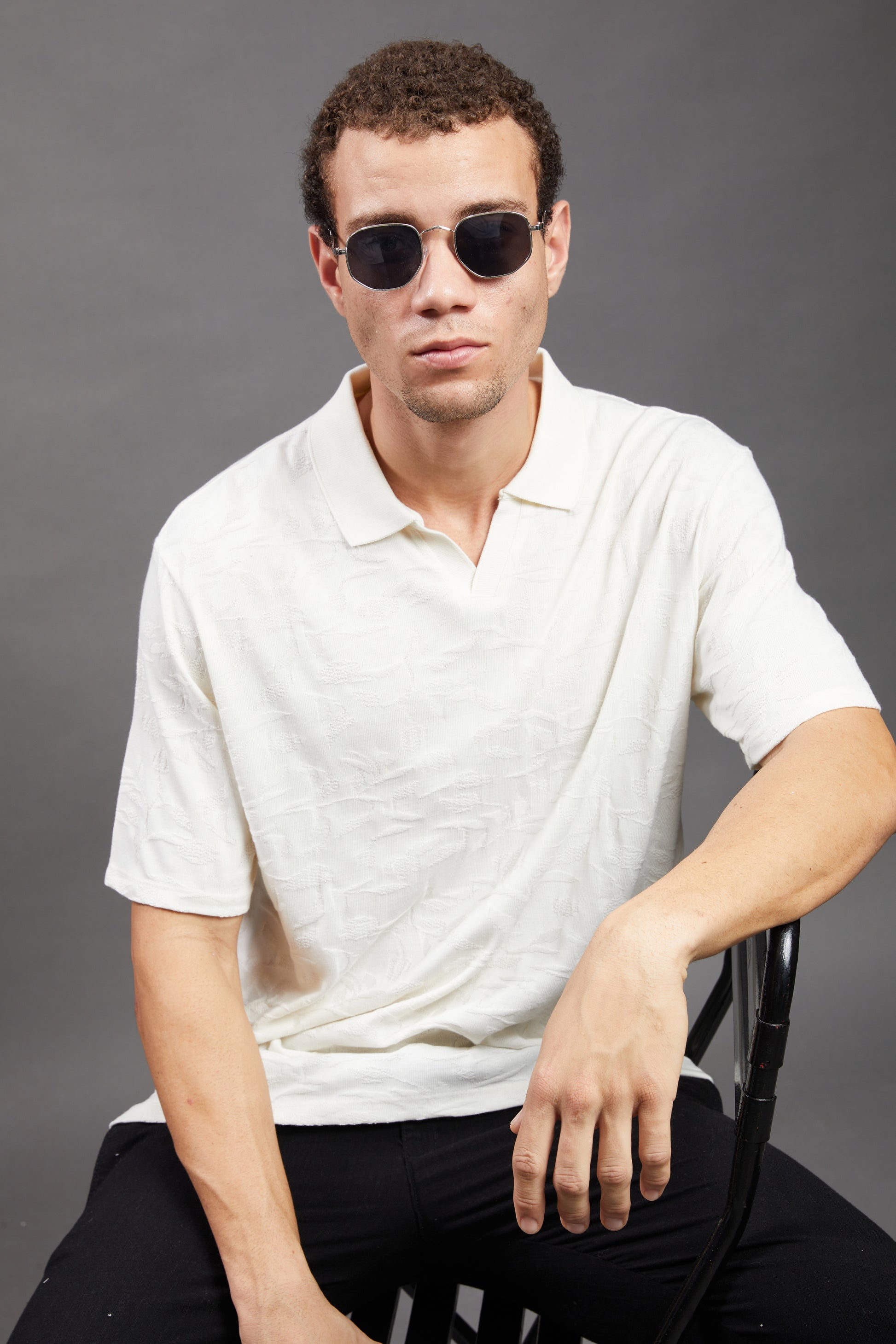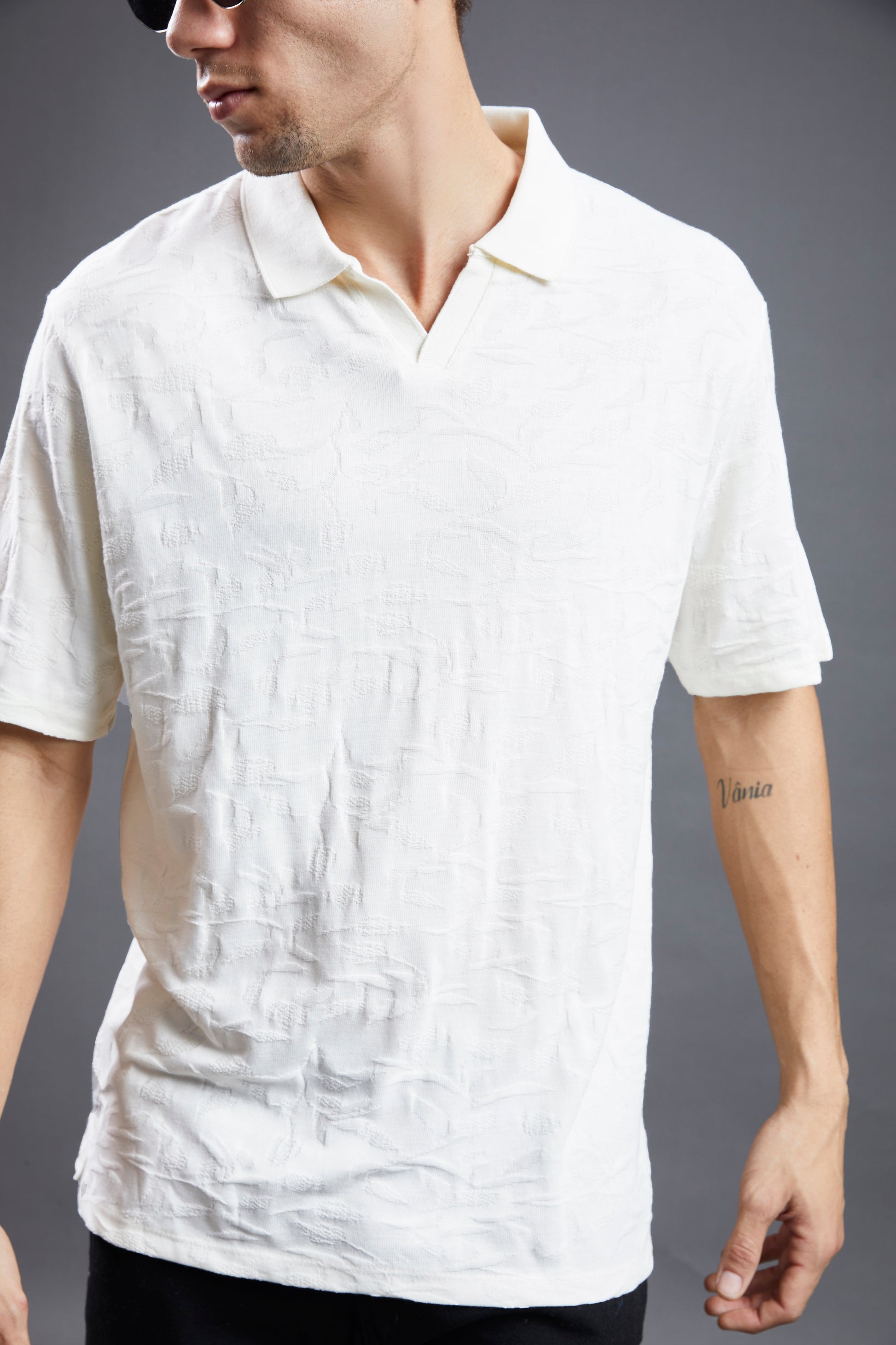 Elevate subtlety with the Ivory Mirage Polo — a soft off-white polo shirt crafted in a textured jacquard knit that mimics gentle foliage patterns. The concealed artistry in the fabric lends it an understated richness, making it ideal for those who appreciate quiet sophistication. Whether you're dressing for a casual meet-up or a refined evening, this piece ensures you remain Offtrend in the best way possible.