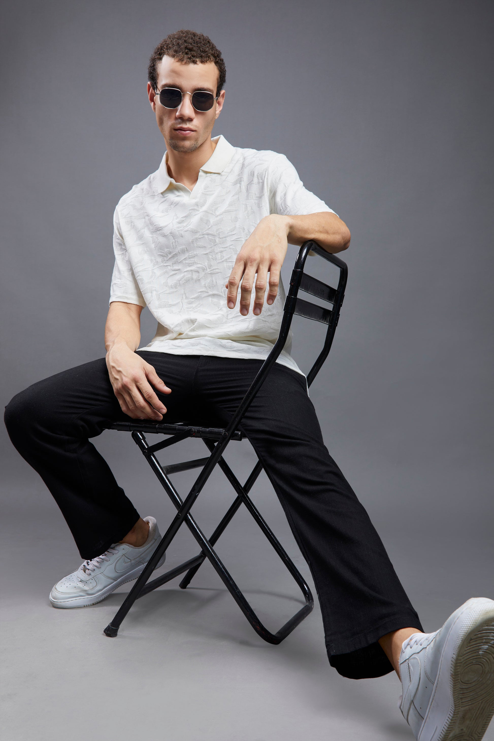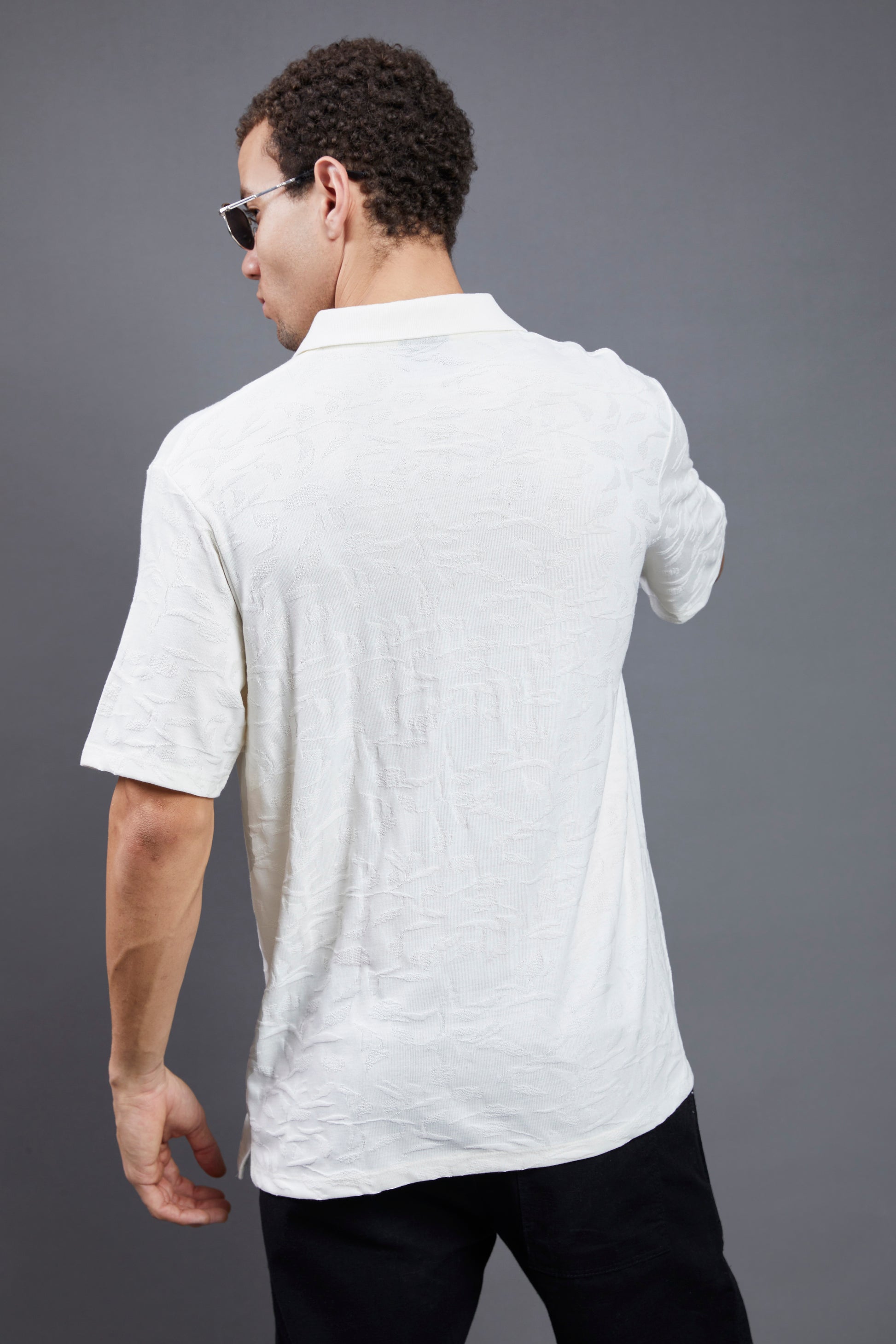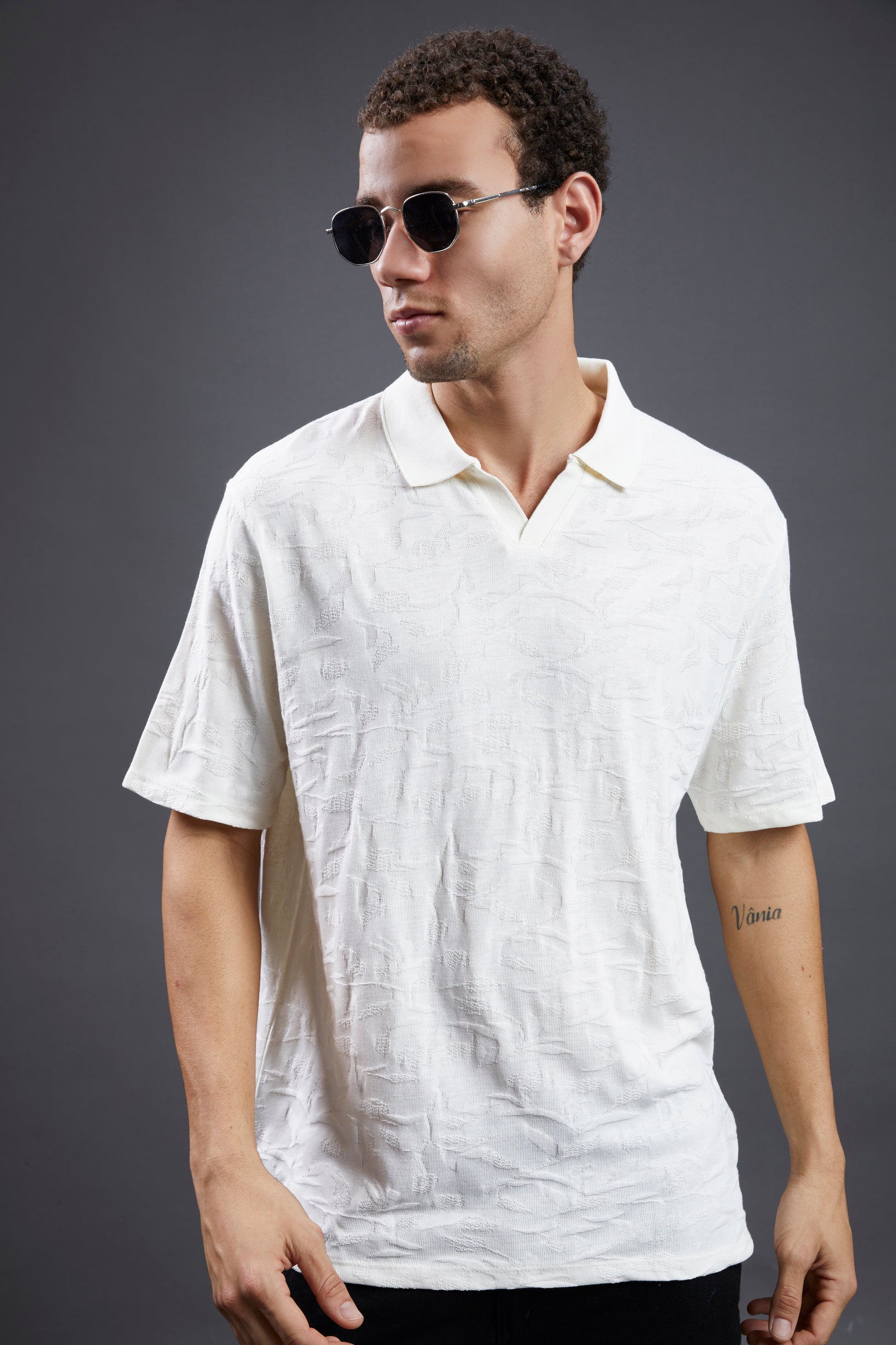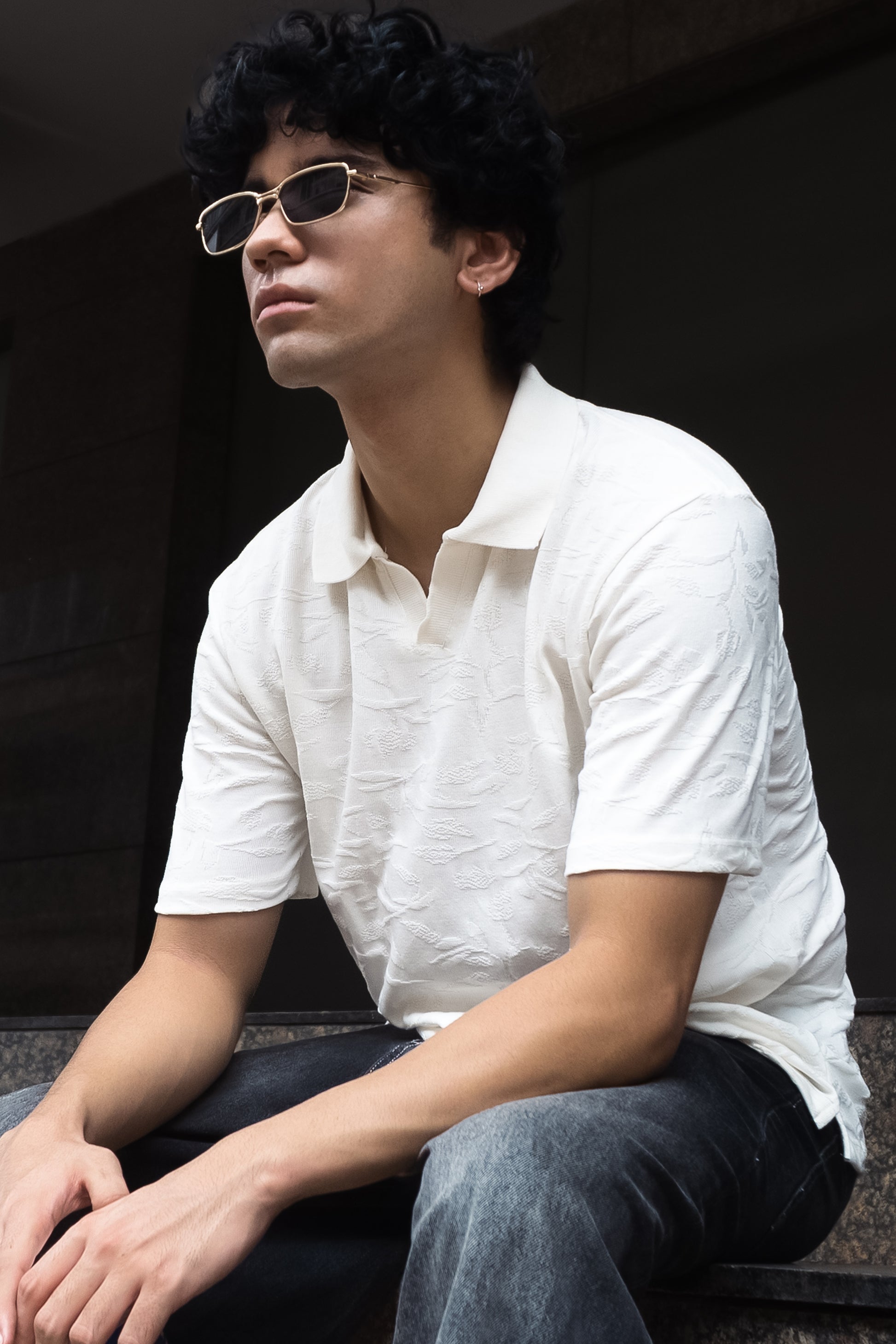 Elevate subtlety with the Ivory Mirage Polo — a soft off-white polo shirt crafted in a textured jacquard knit that mimics gentle foliage patterns. The concealed artistry in the fabric lends it an understated richness, making it ideal for those who appreciate quiet sophistication. Whether you're dressing for a casual meet-up or a refined evening, this piece ensures you remain Offtrend in the best way possible.
