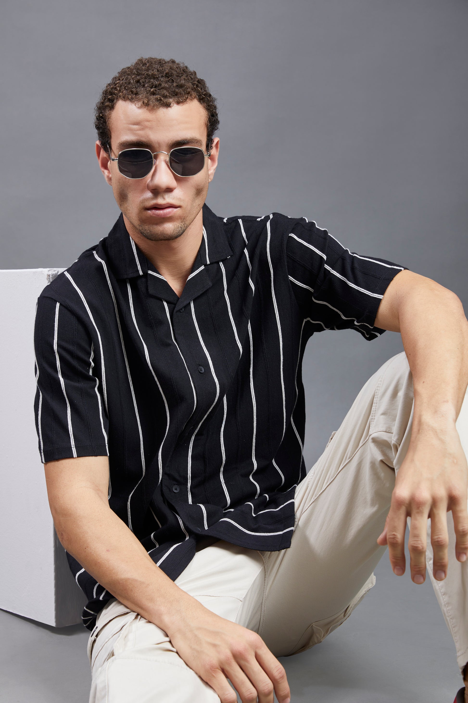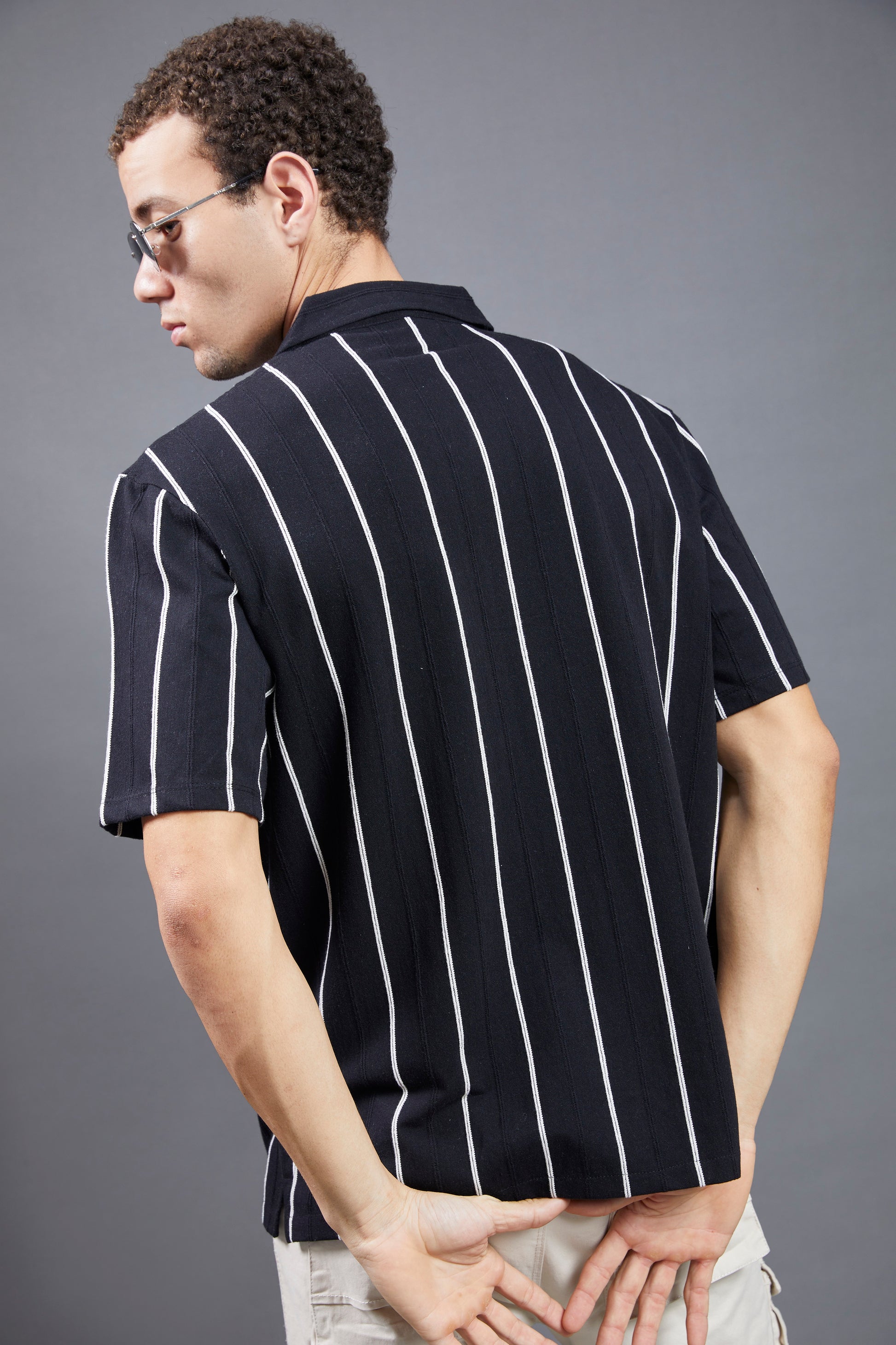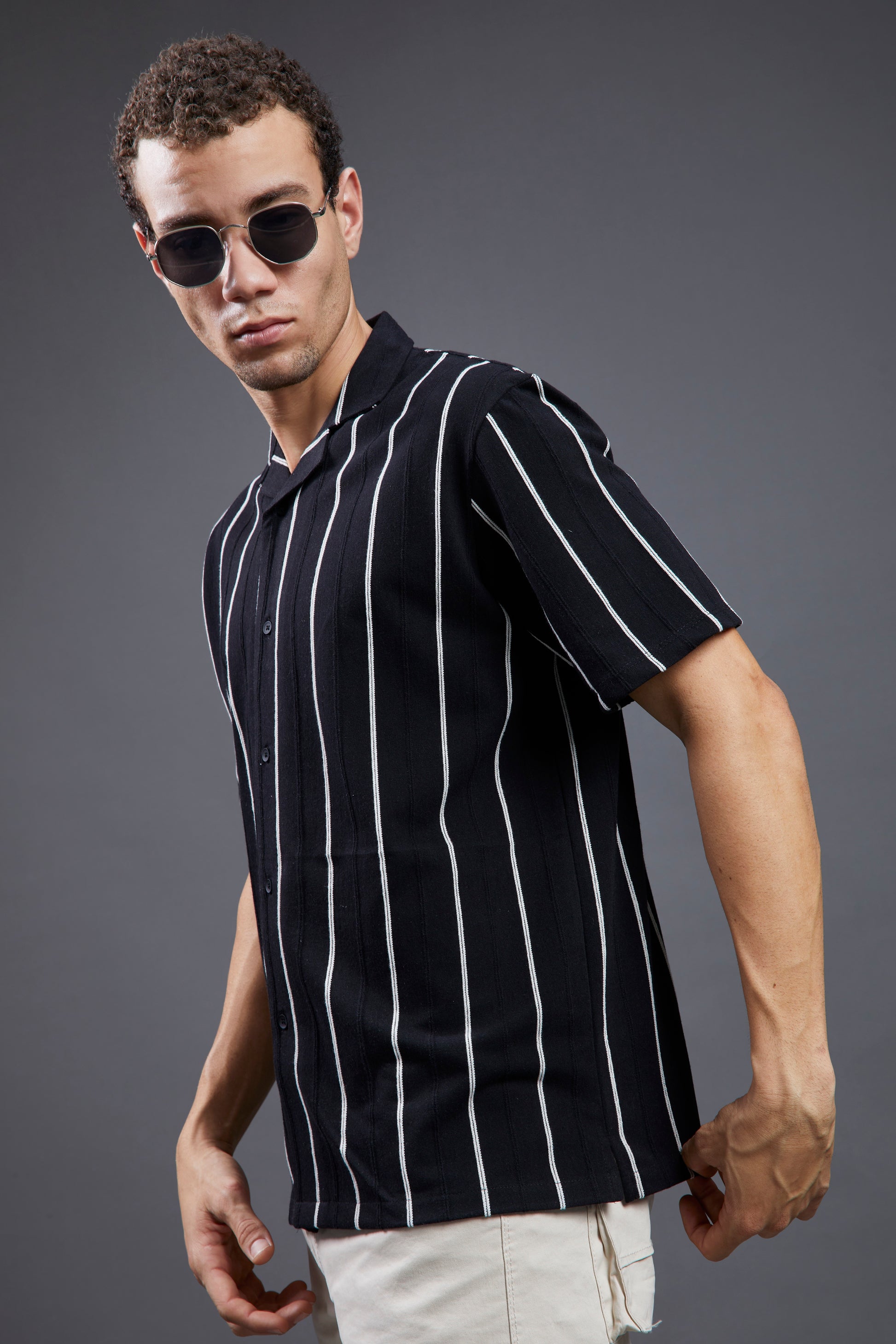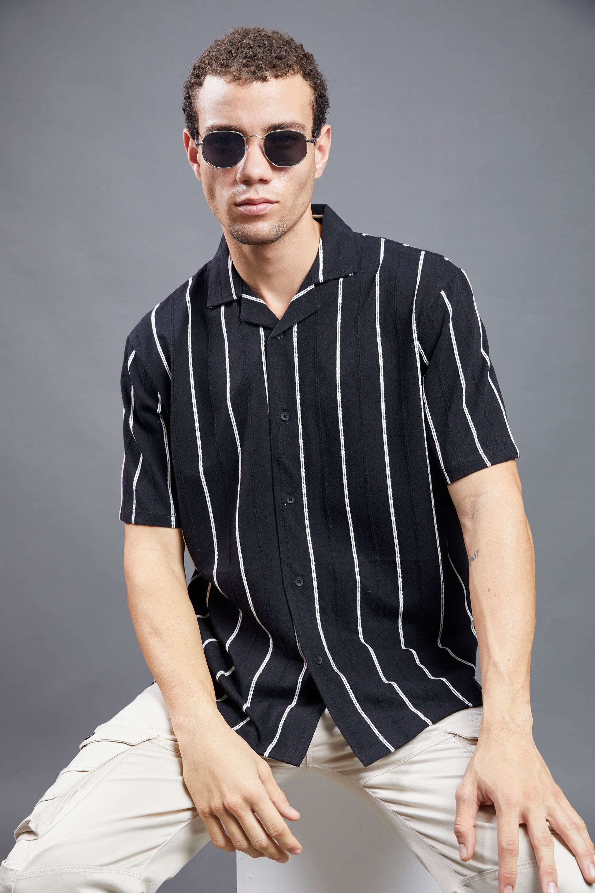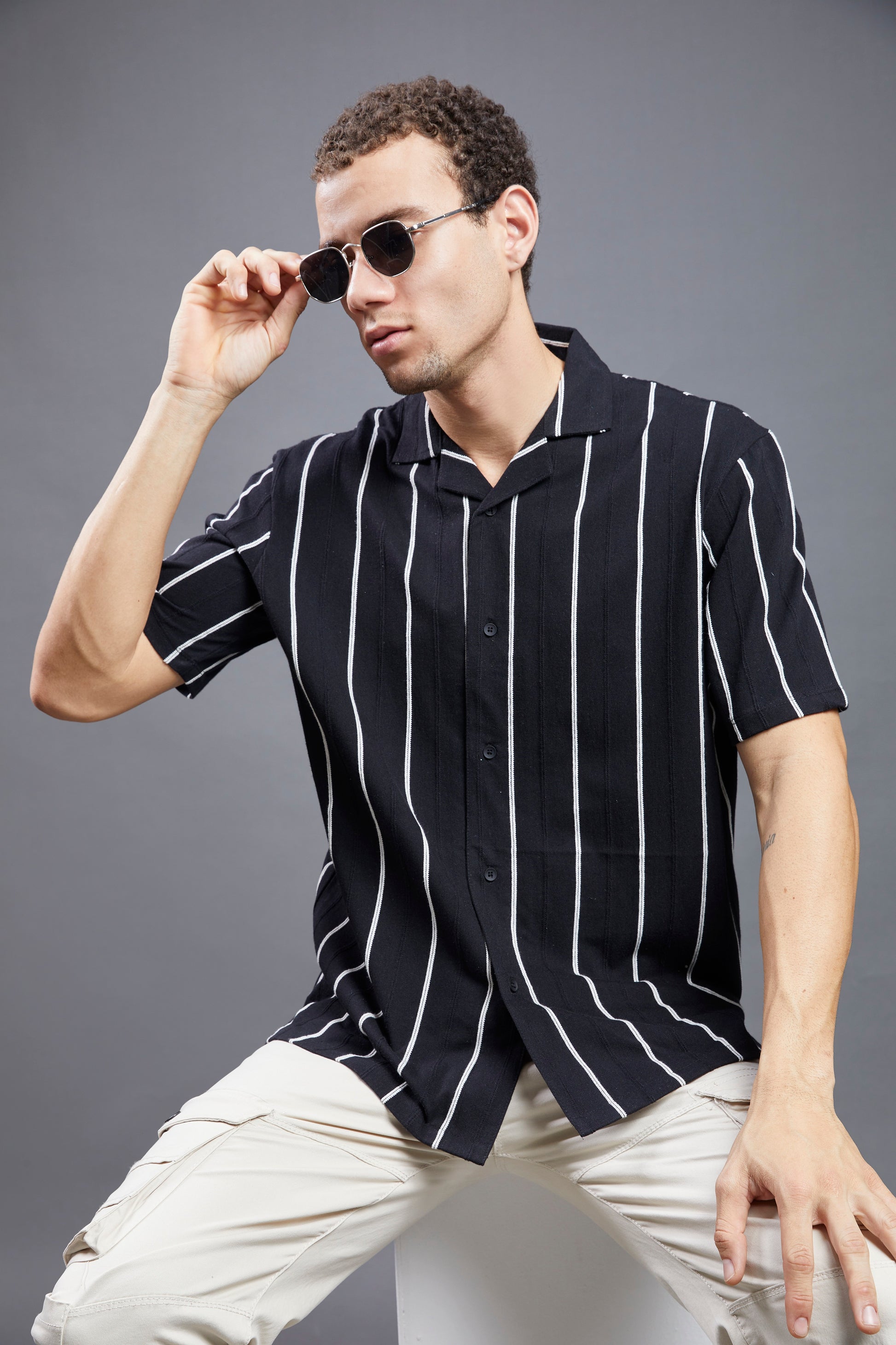Bold, minimal, and built for the ones who never blend in — Monochrome Pulse brings sleek vertical stripes to life on jet black fabric. This Cuban-collared shirt commands attention without trying too hard, pairing crisp white lines with textured finesse. Designed for day-to-night confidence, it’s the kind of shirt that speaks before you do.