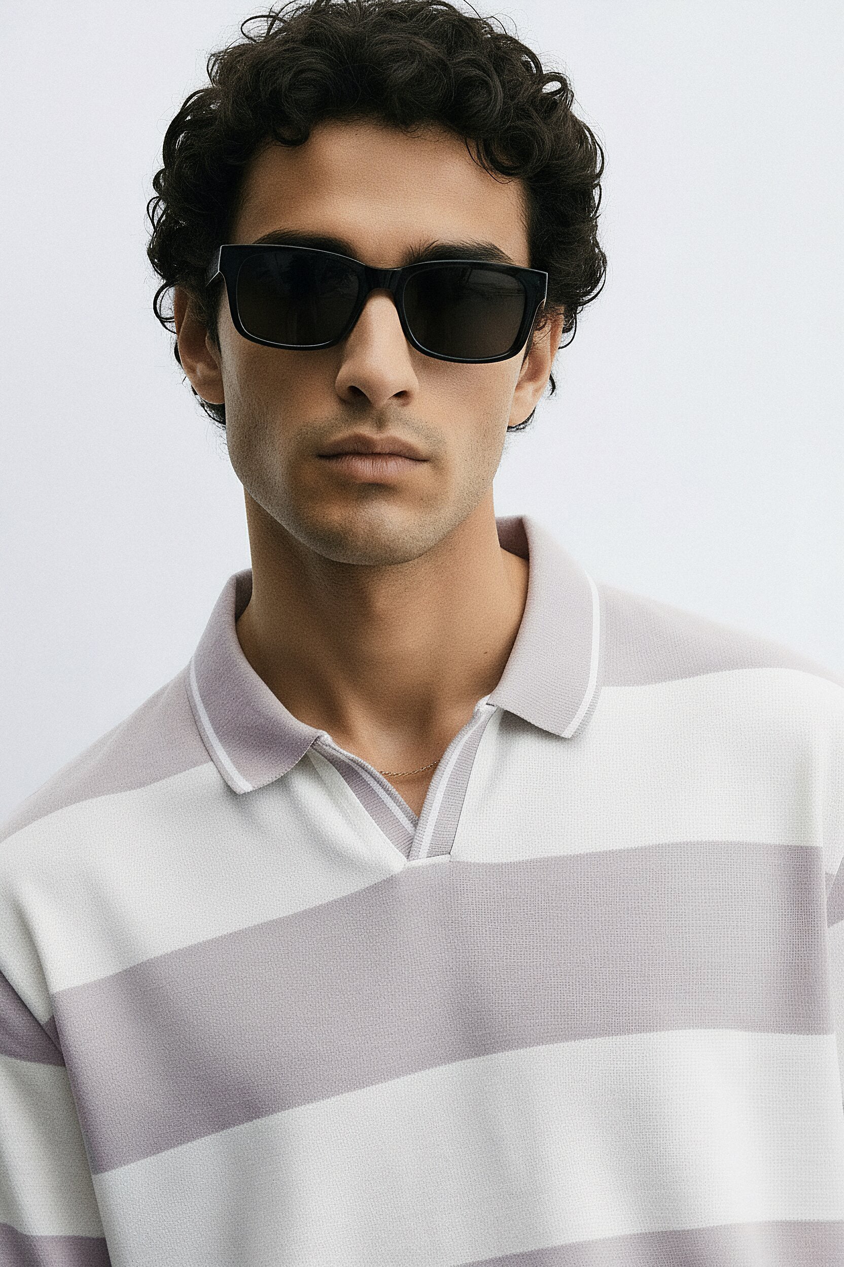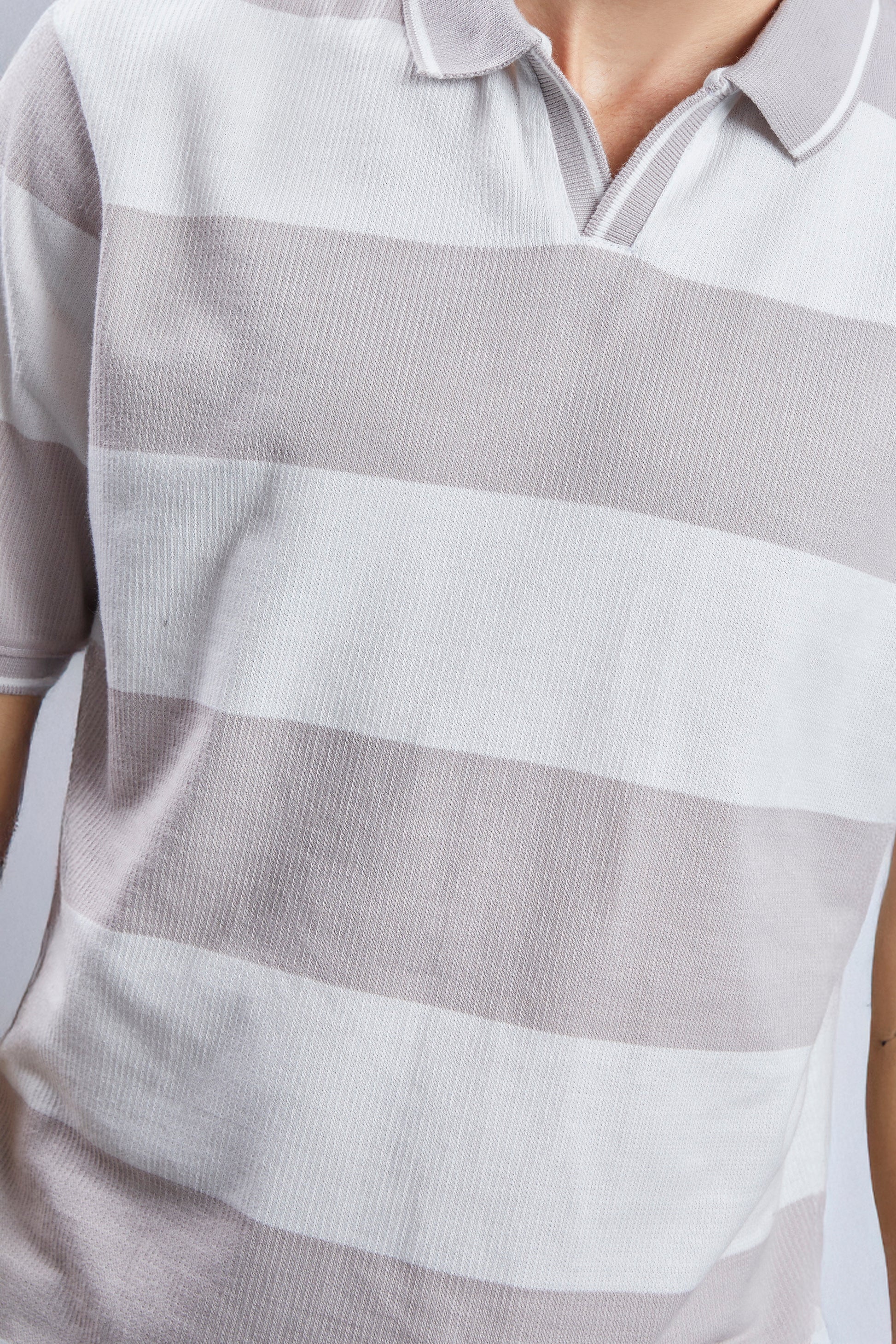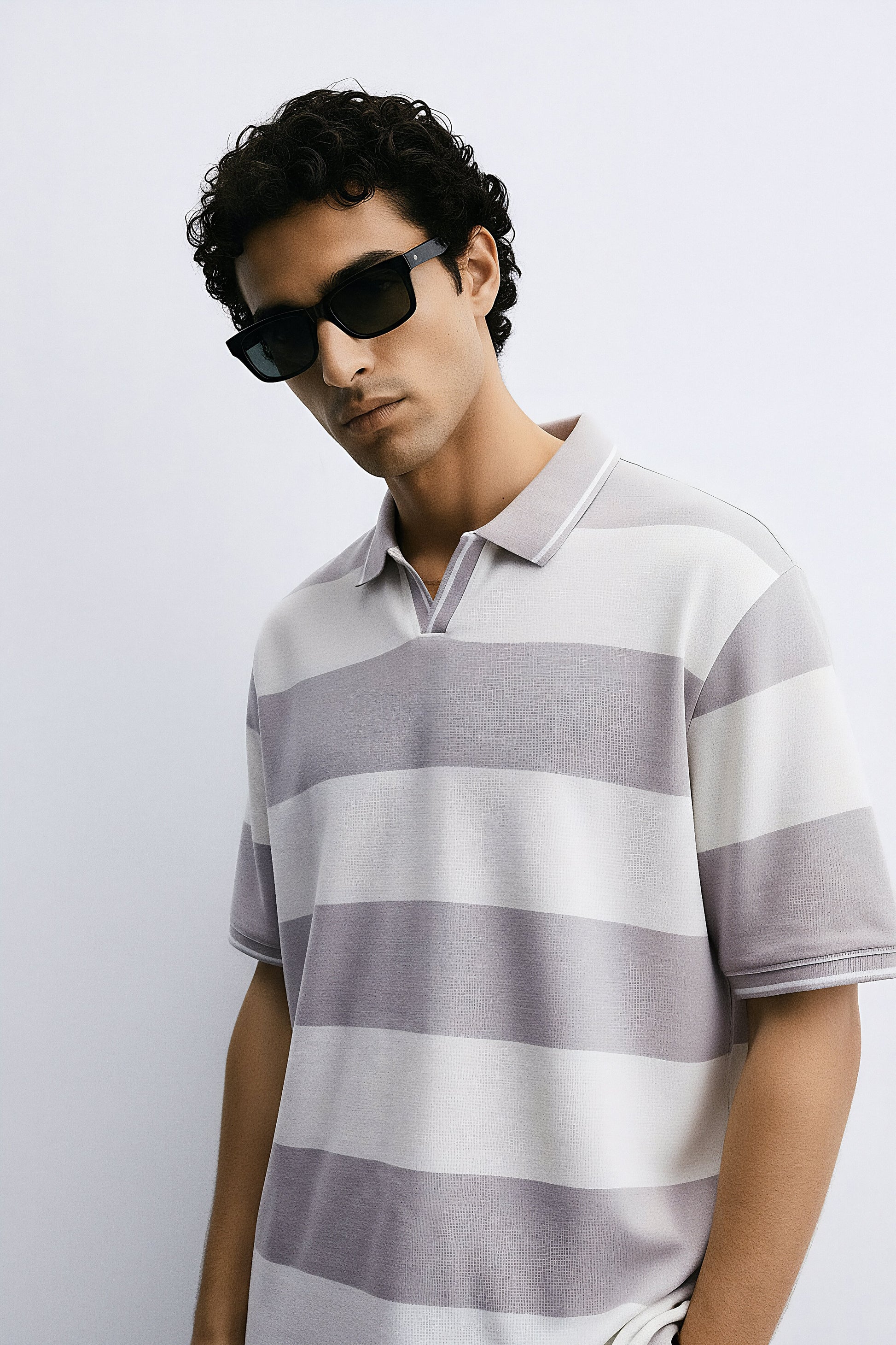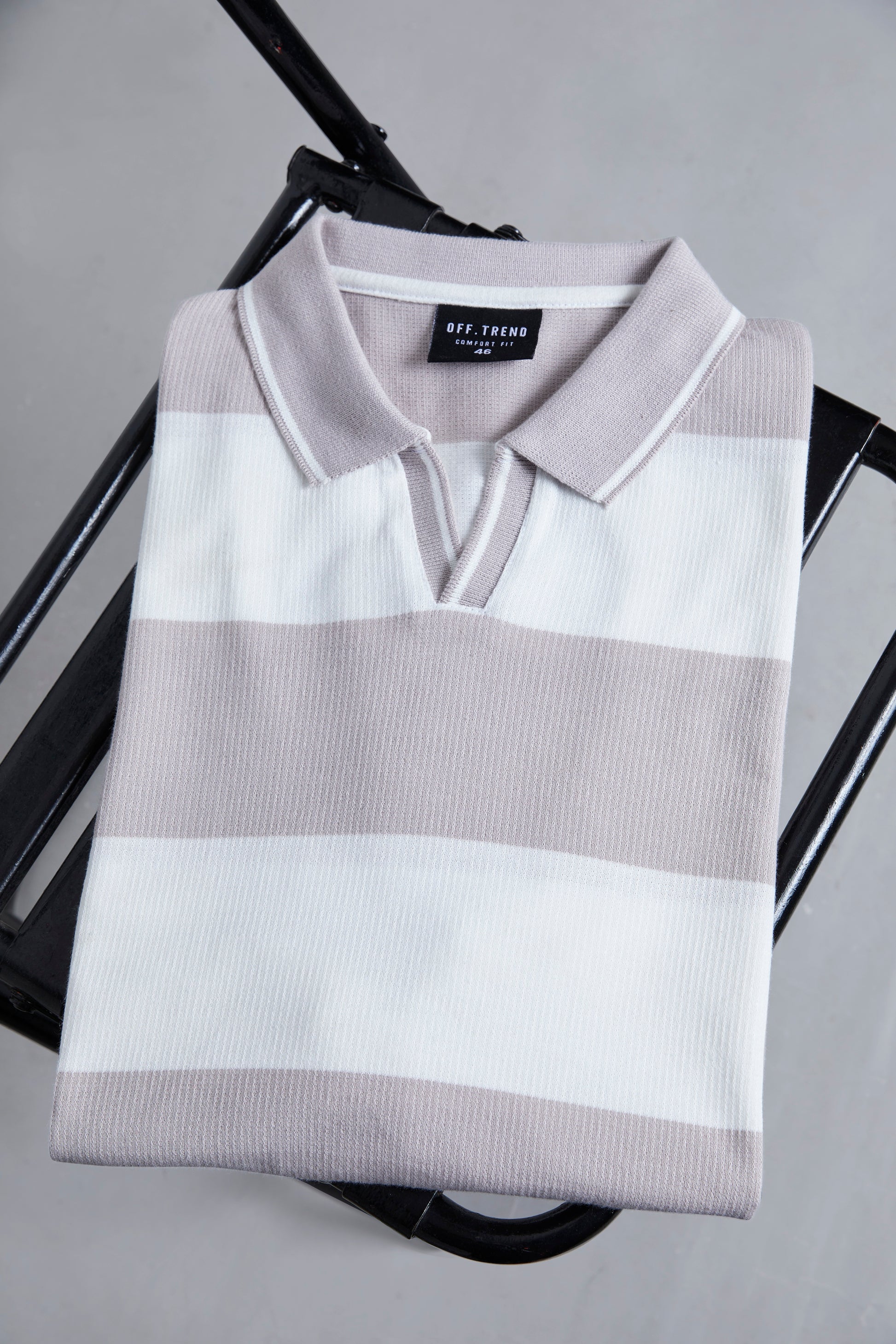 A timeless blend of calm and character, Muted Rhythm features wide alternating stripes in earthy taupe and soft ivory, evoking understated elegance. Crafted in textured knit cotton for breathable comfort and tactile depth, this polo is perfect for those who prefer subtlety over noise. Finished with a ribbed collar and sleeve cuffs, it's a refined staple that makes a statement—quietly, but confidently.