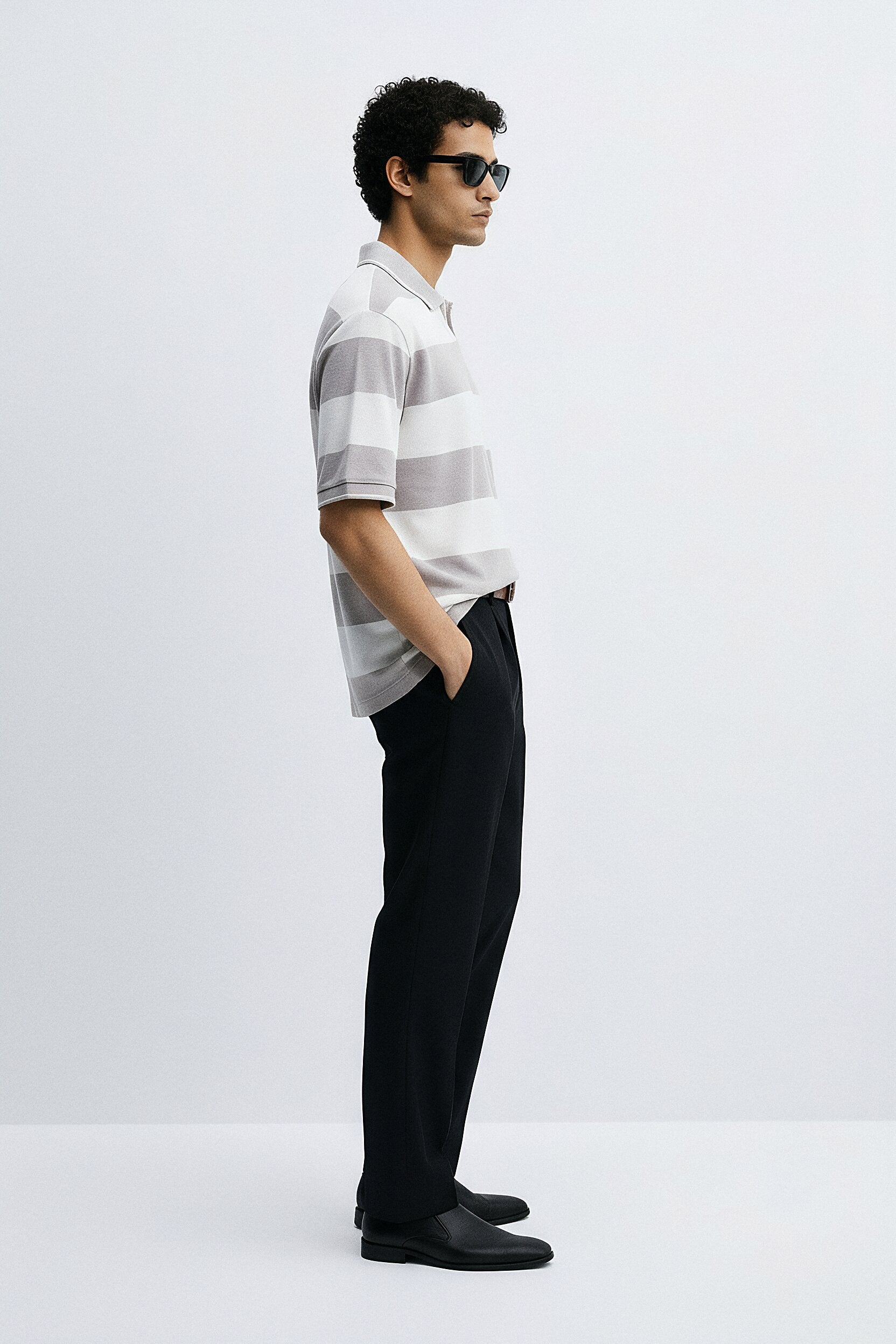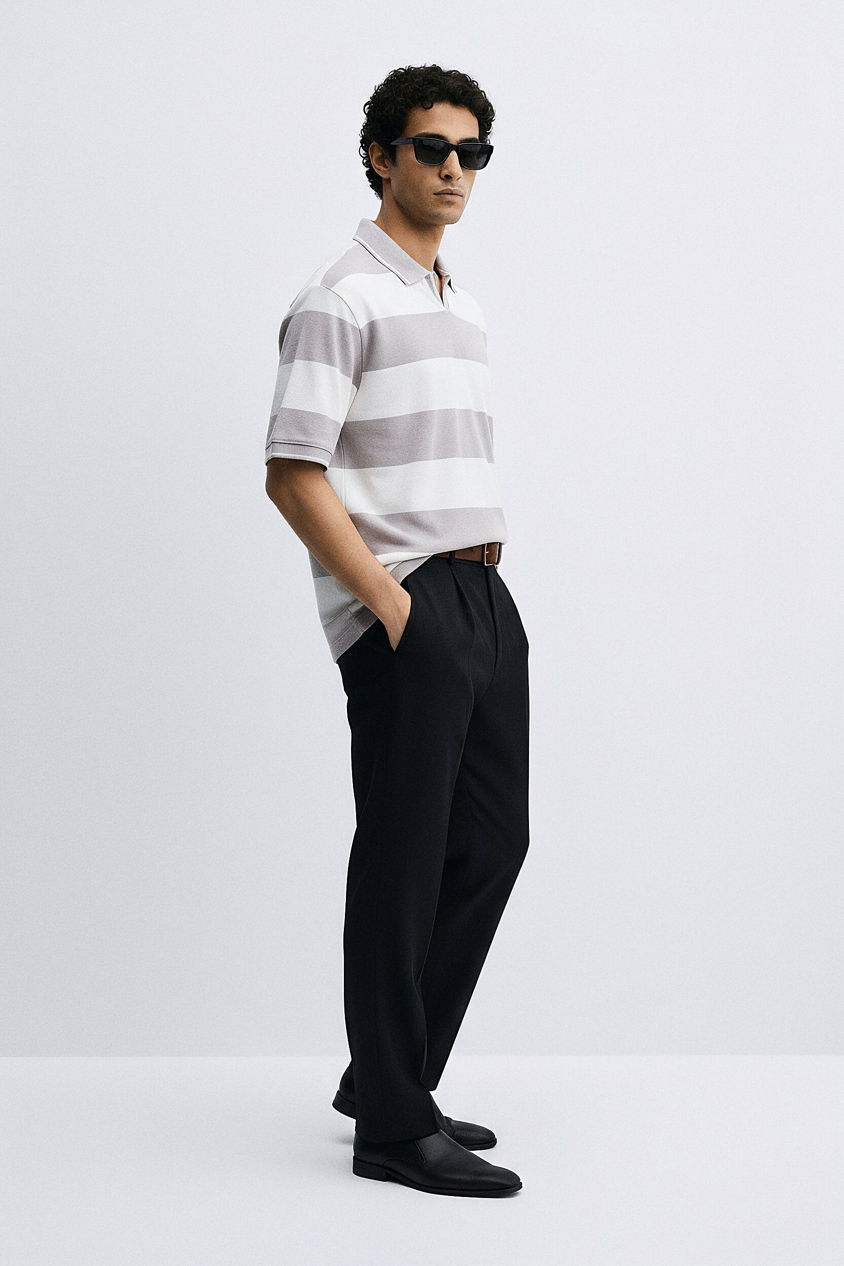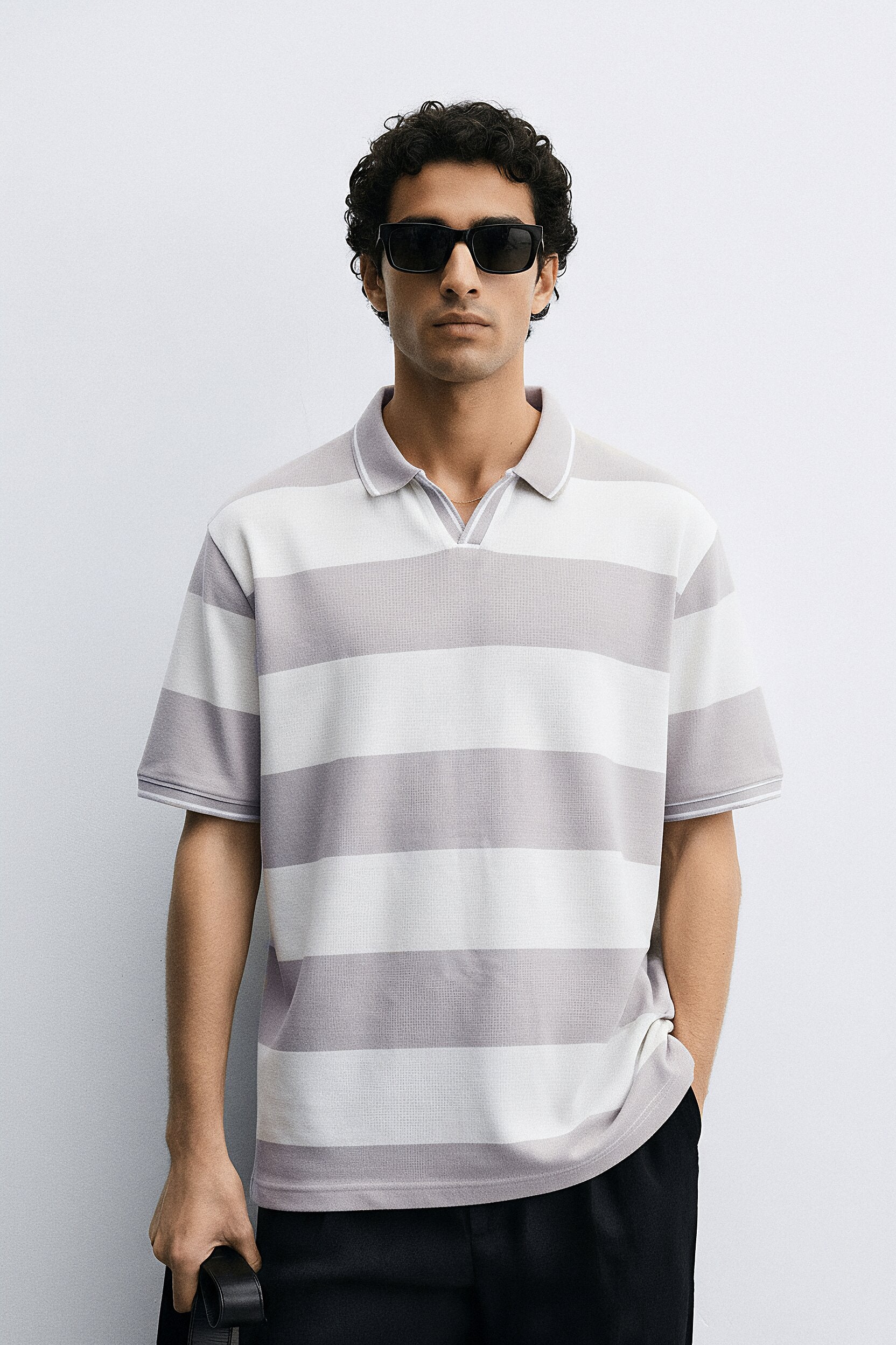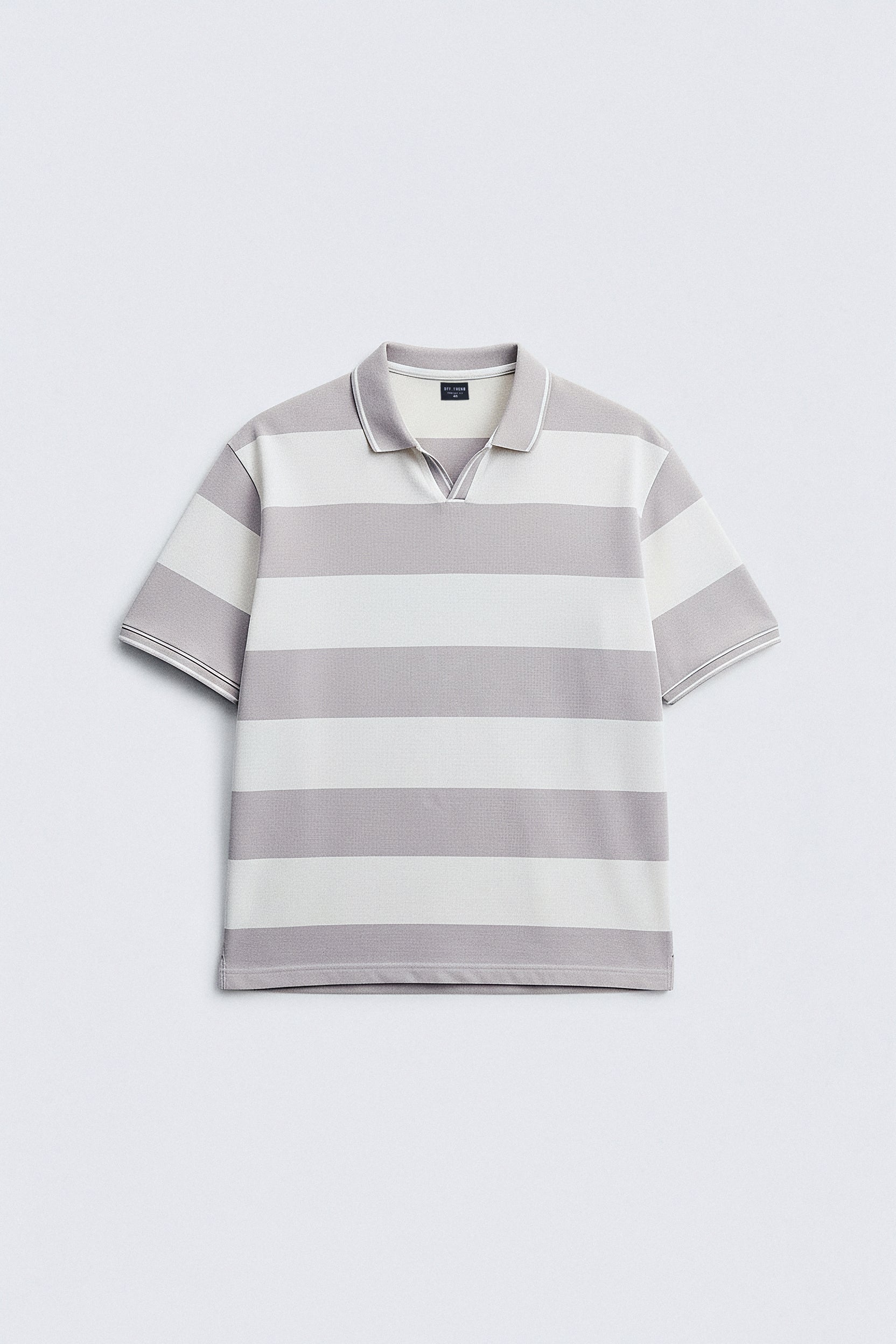 A timeless blend of calm and character, Muted Rhythm features wide alternating stripes in earthy taupe and soft ivory, evoking understated elegance. Crafted in textured knit cotton for breathable comfort and tactile depth, this polo is perfect for those who prefer subtlety over noise. Finished with a ribbed collar and sleeve cuffs, it's a refined staple that makes a statement—quietly, but confidently.