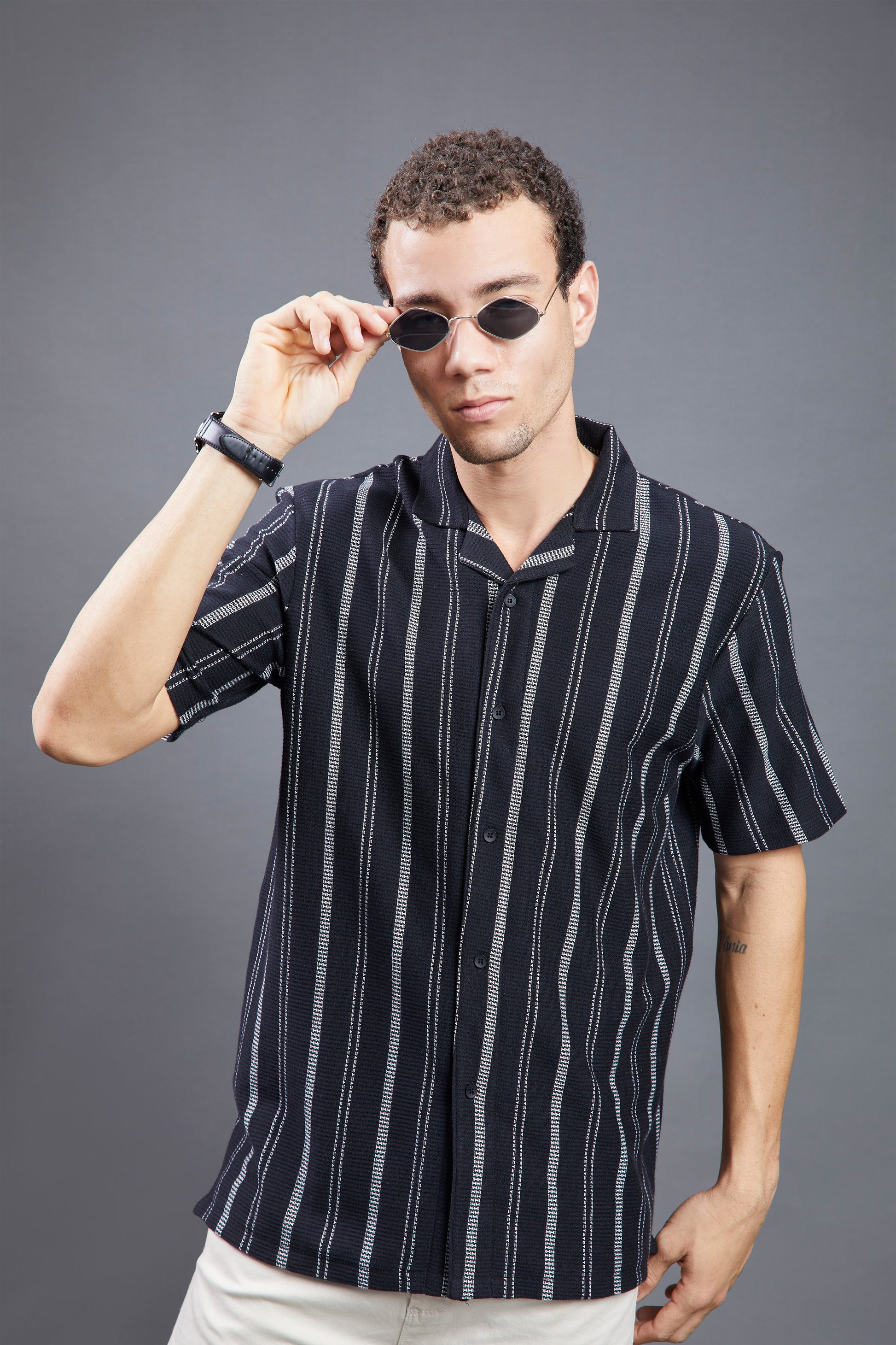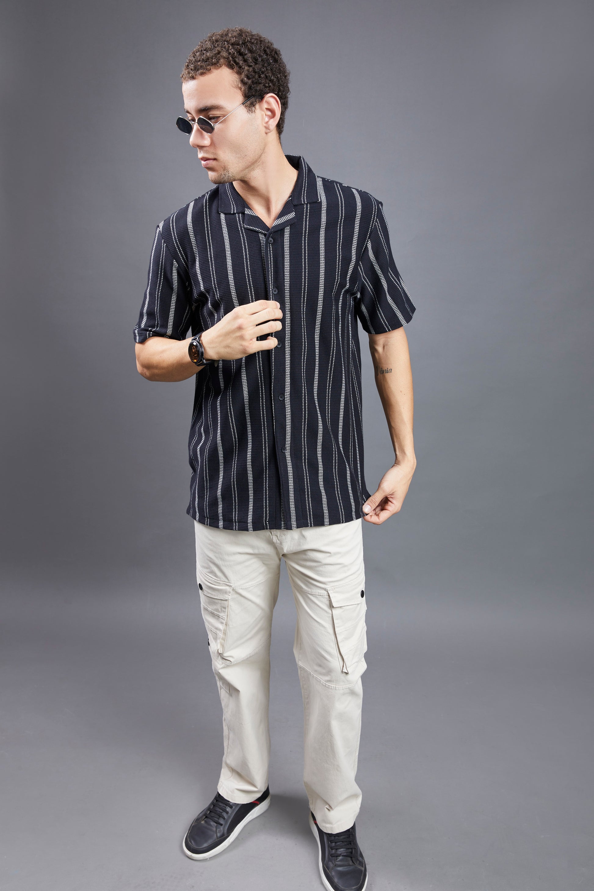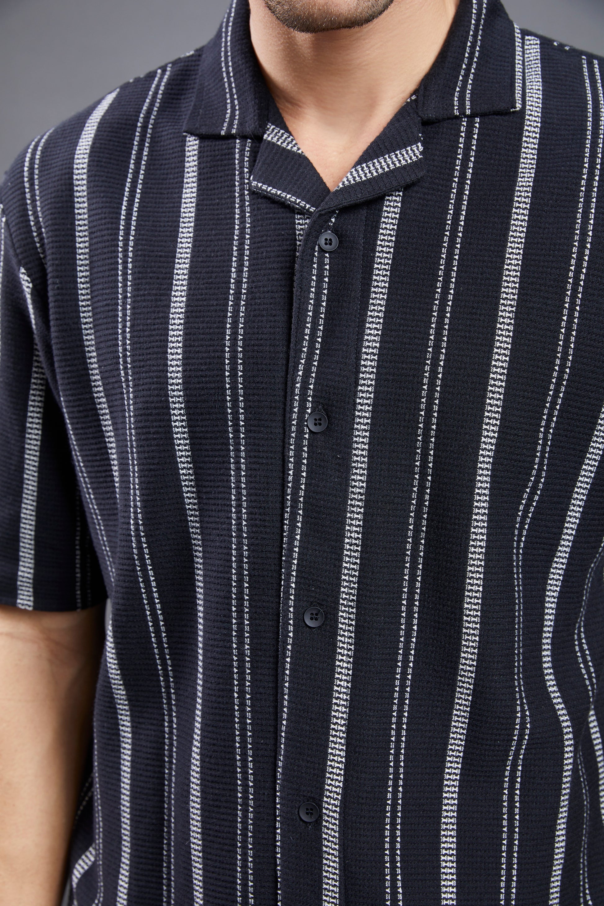 A soft-textured Cuban crafted in deep navy with subtle distorted stripes, like static waves on a quiet screen. It’s built for those who don’t chase attention, but still own the room.