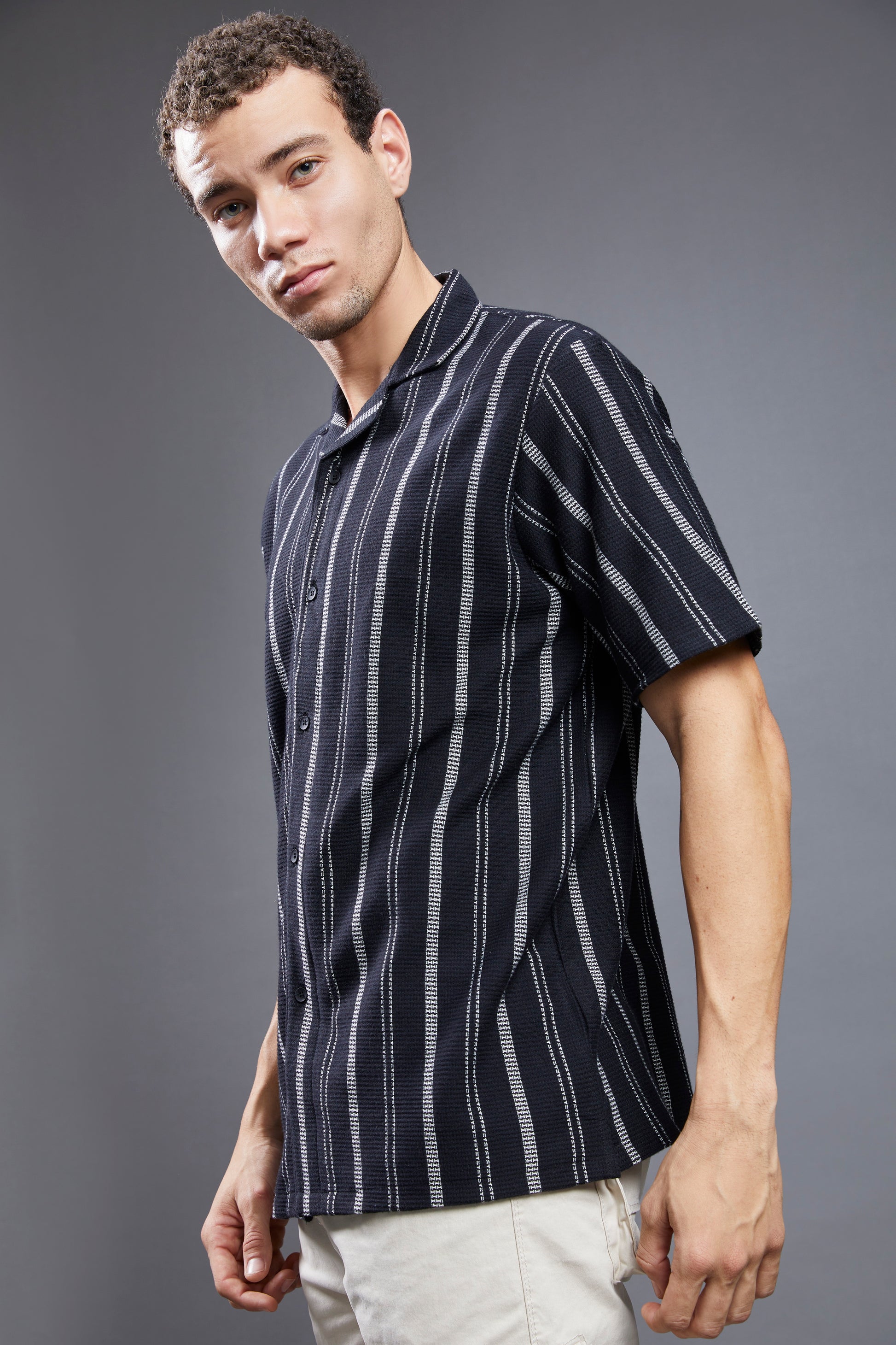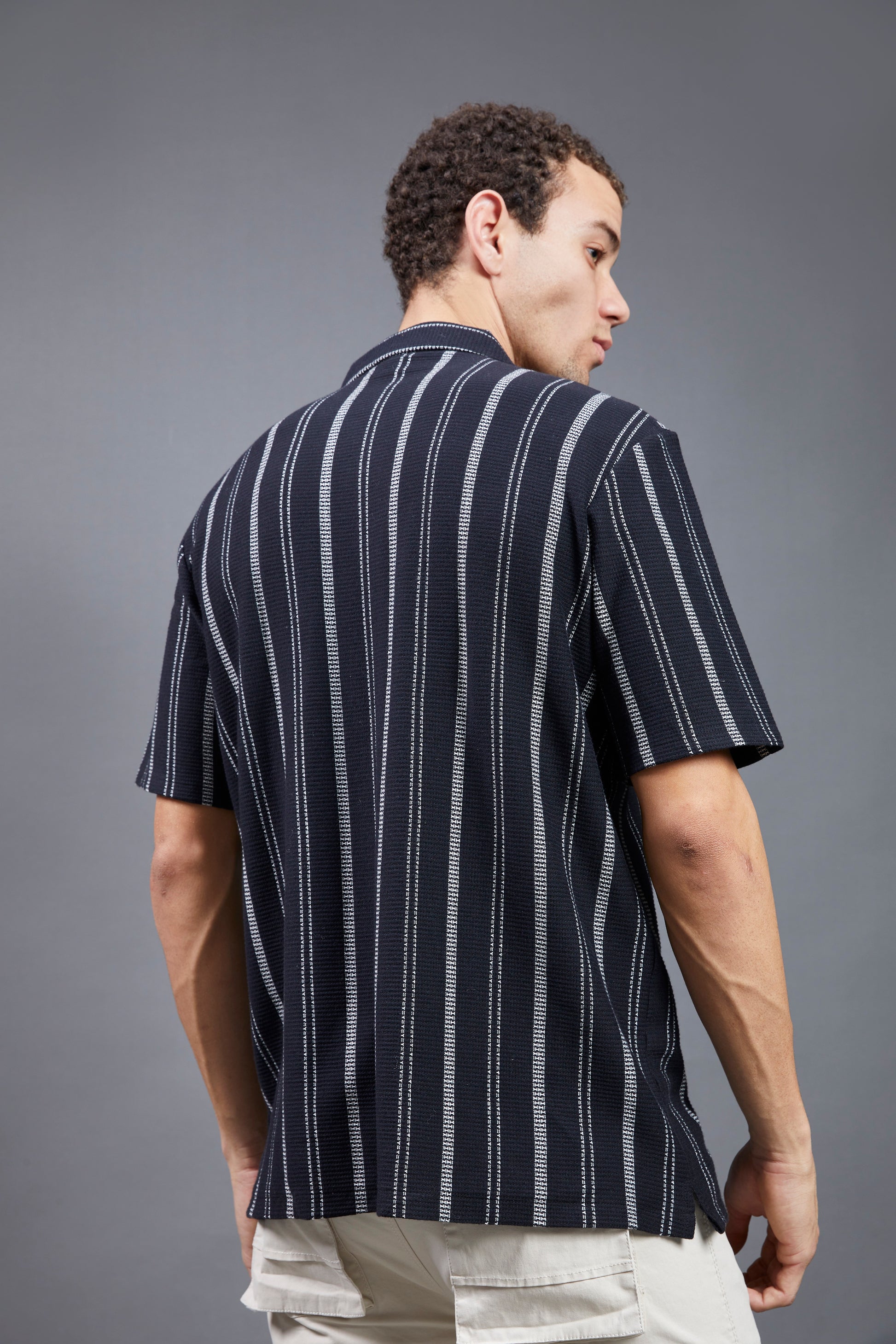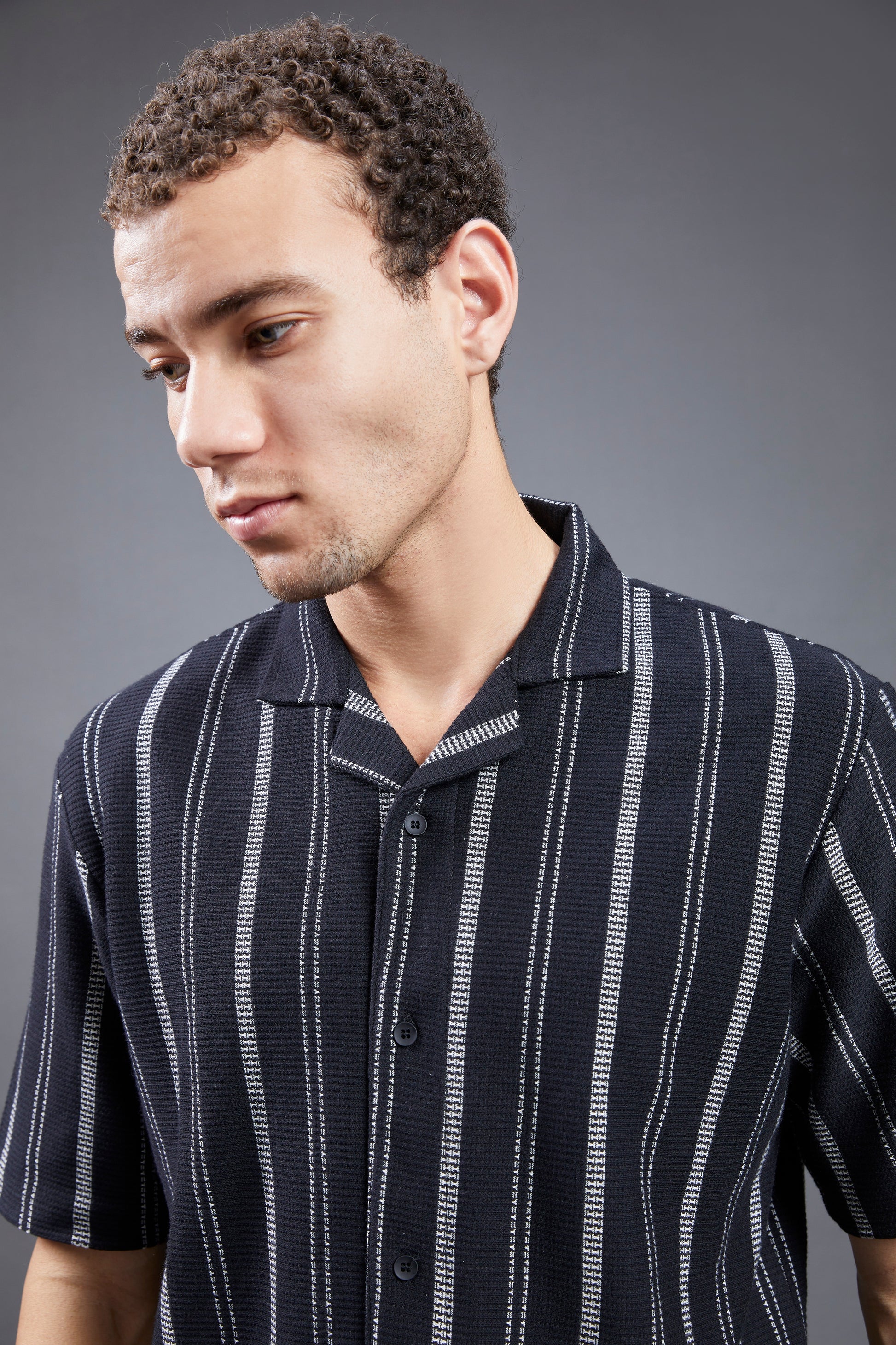 A soft-textured Cuban crafted in deep navy with subtle distorted stripes, like static waves on a quiet screen. It’s built for those who don’t chase attention, but still own the room.