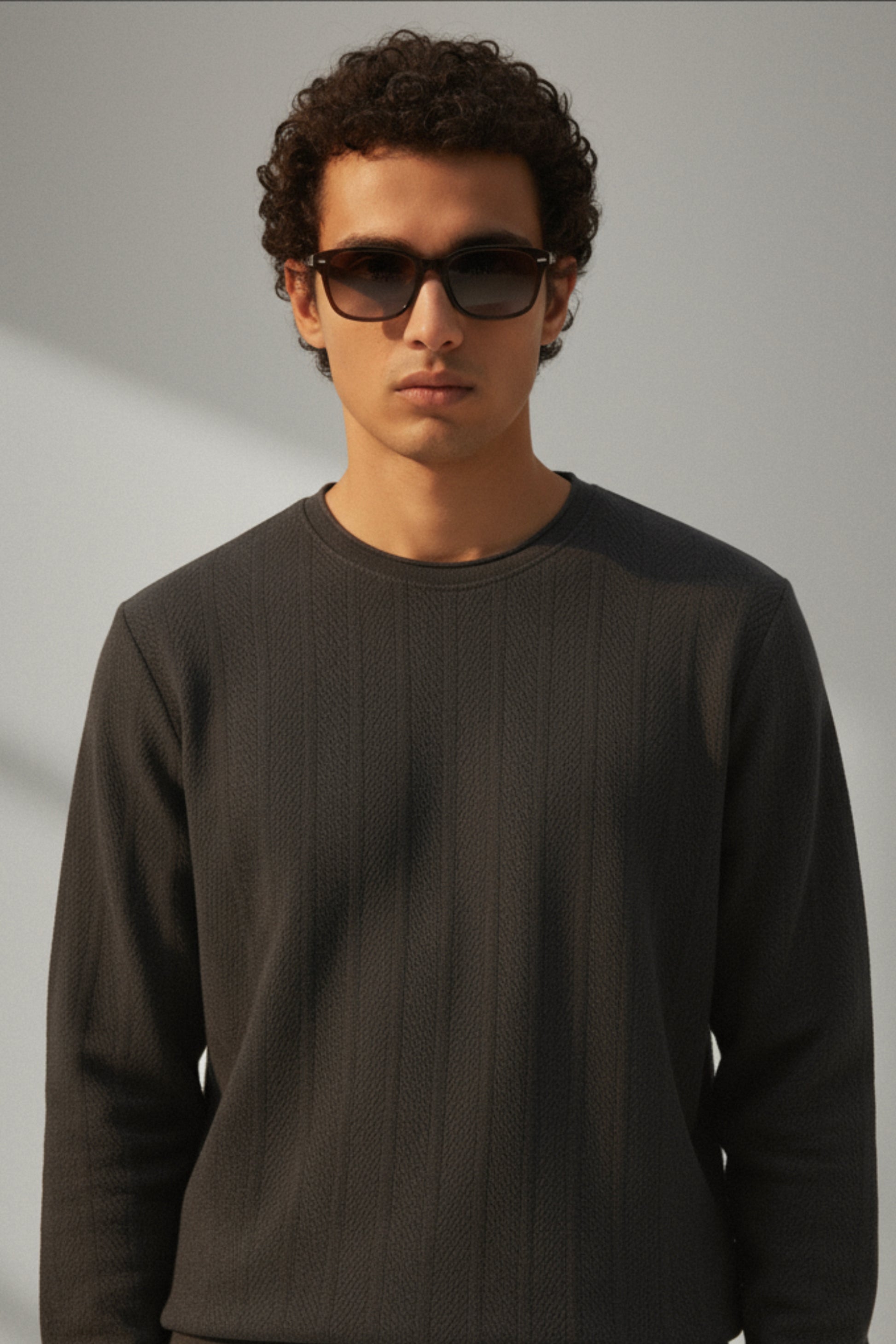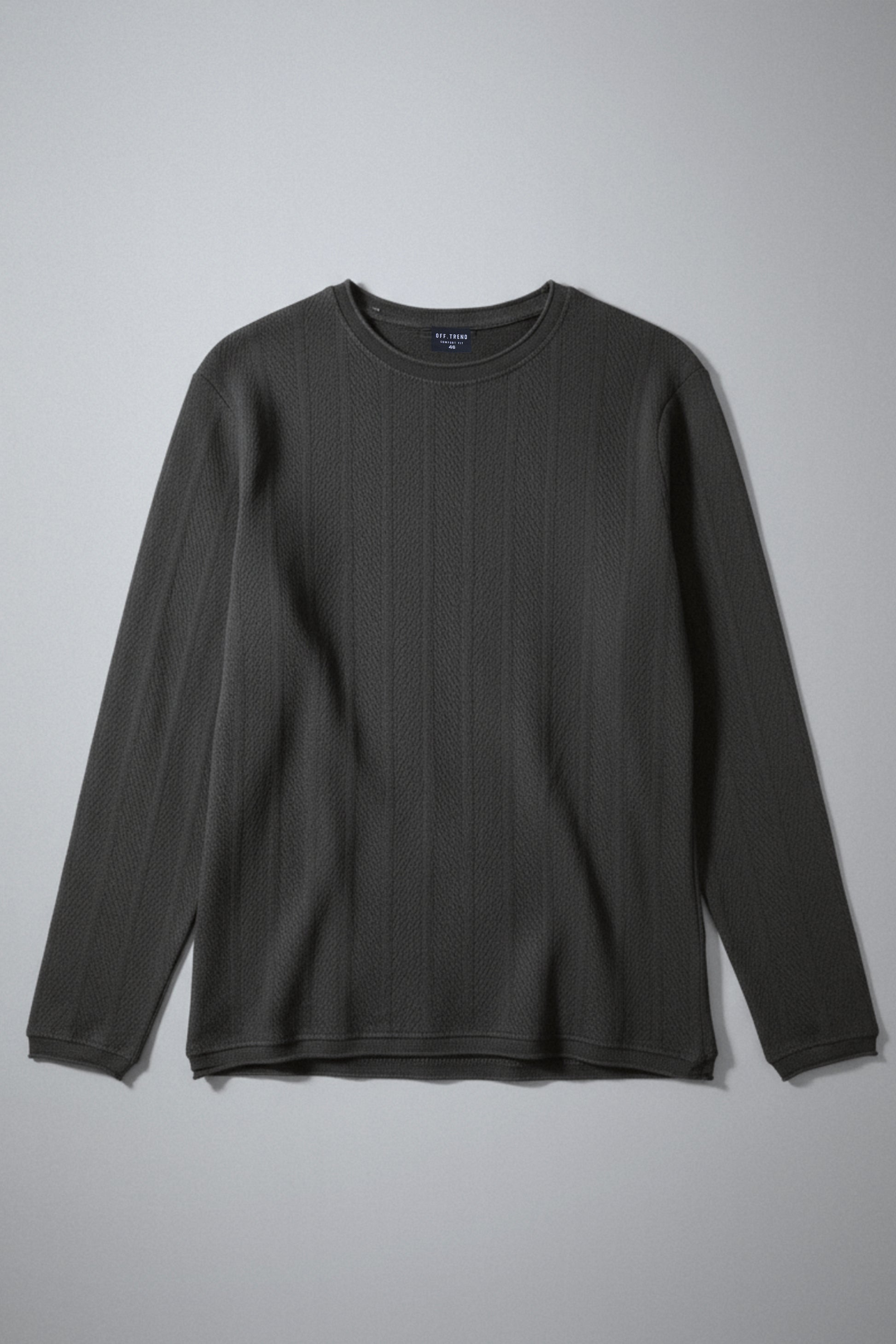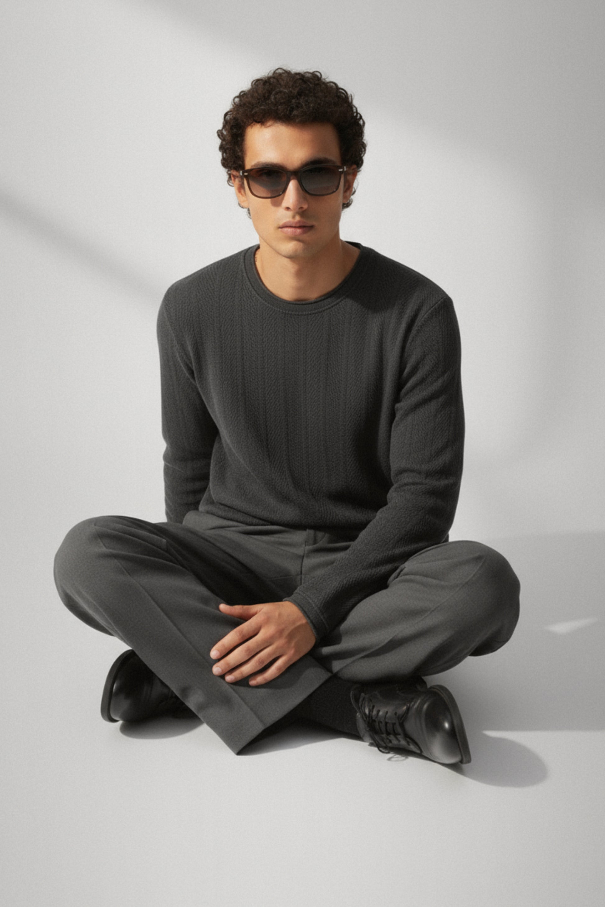 The Parallel Calm – Charcoal Mist knit tee brings together depth and restraint. Crafted in a dense 260 GSM textured knit, its structured fall and subtle rib pattern embody effortless composure.