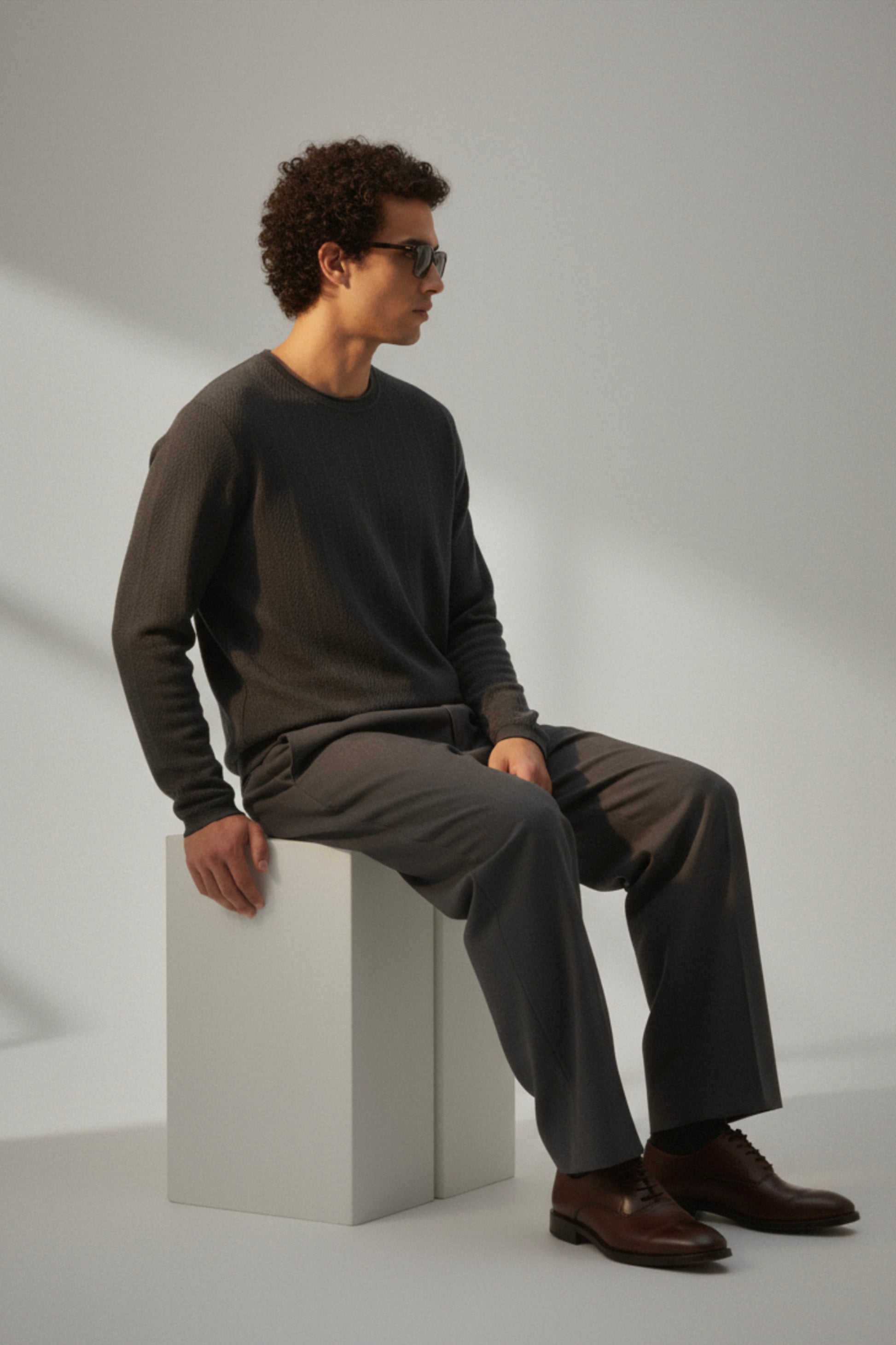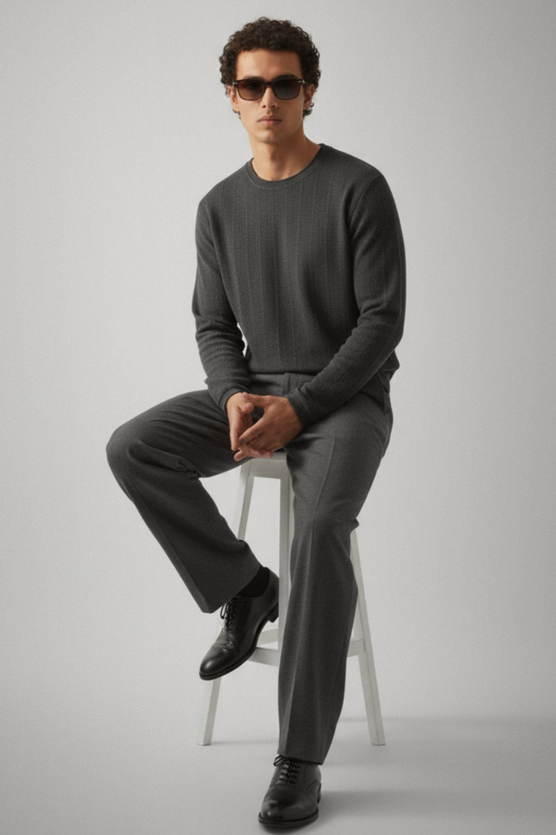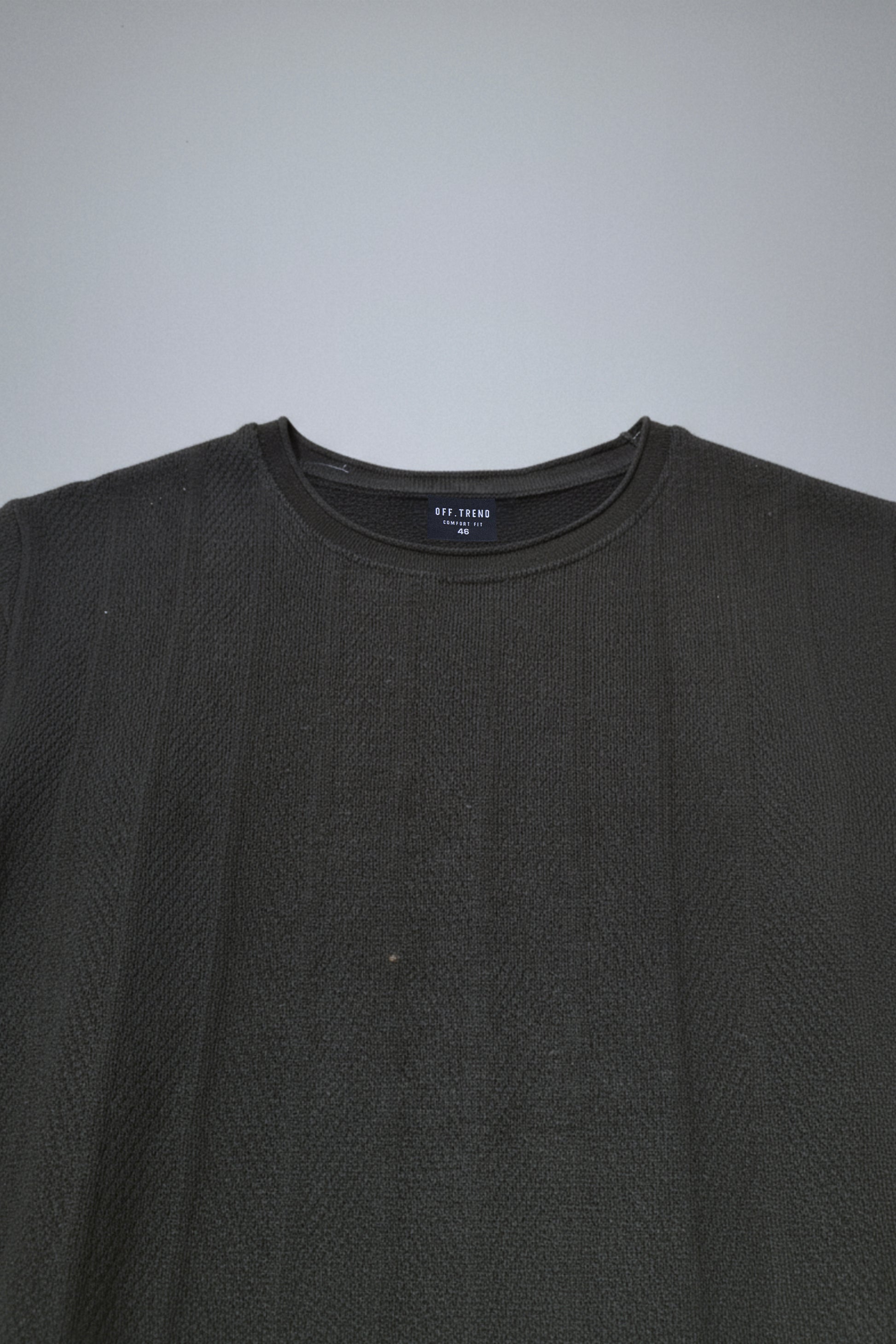 The Parallel Calm – Charcoal Mist knit tee brings together depth and restraint. Crafted in a dense 260 GSM textured knit, its structured fall and subtle rib pattern embody effortless composure.