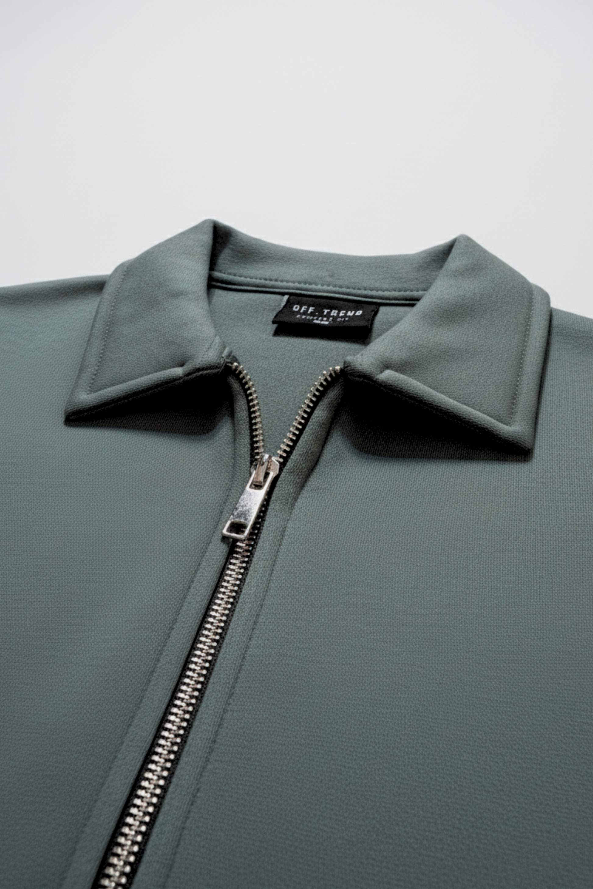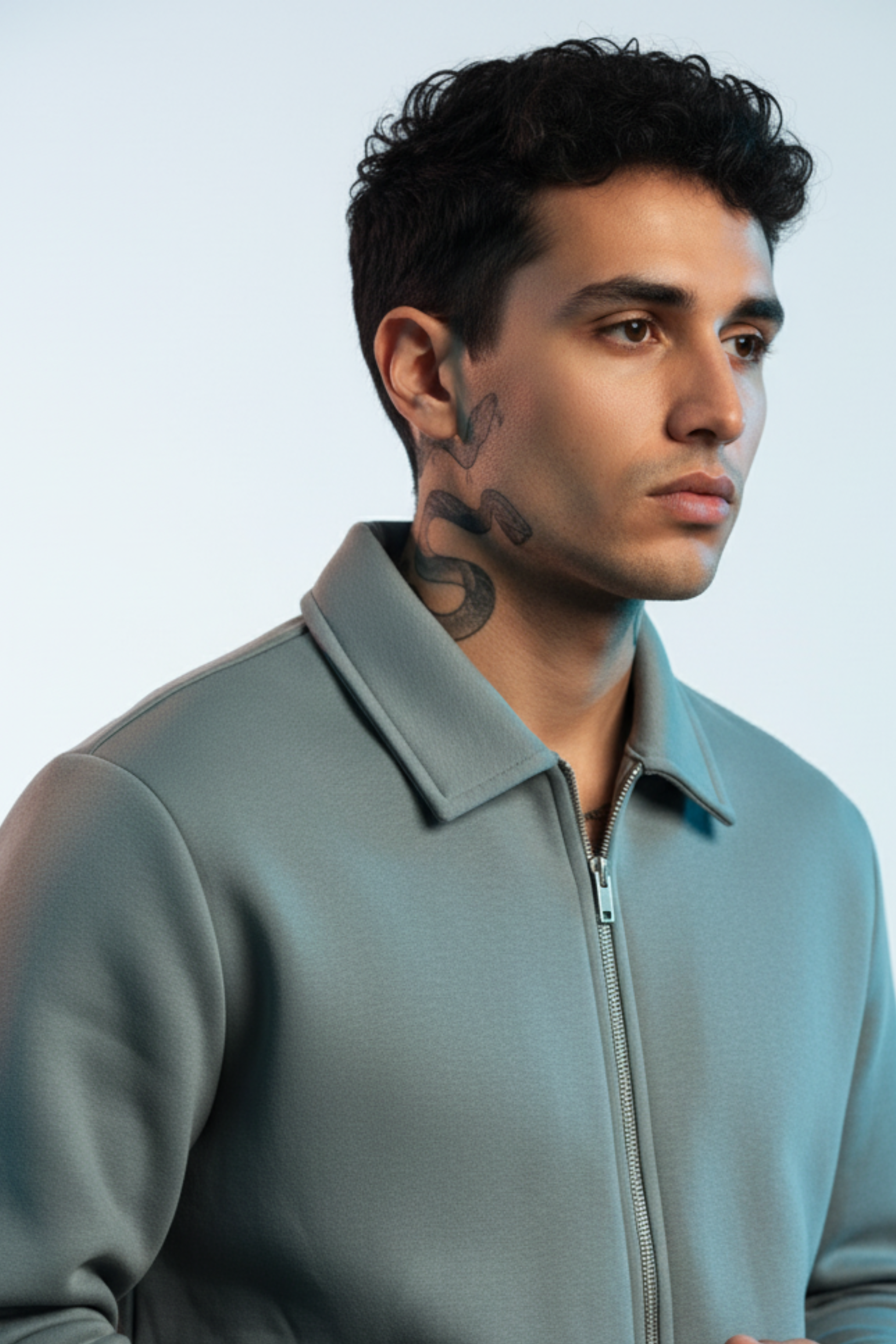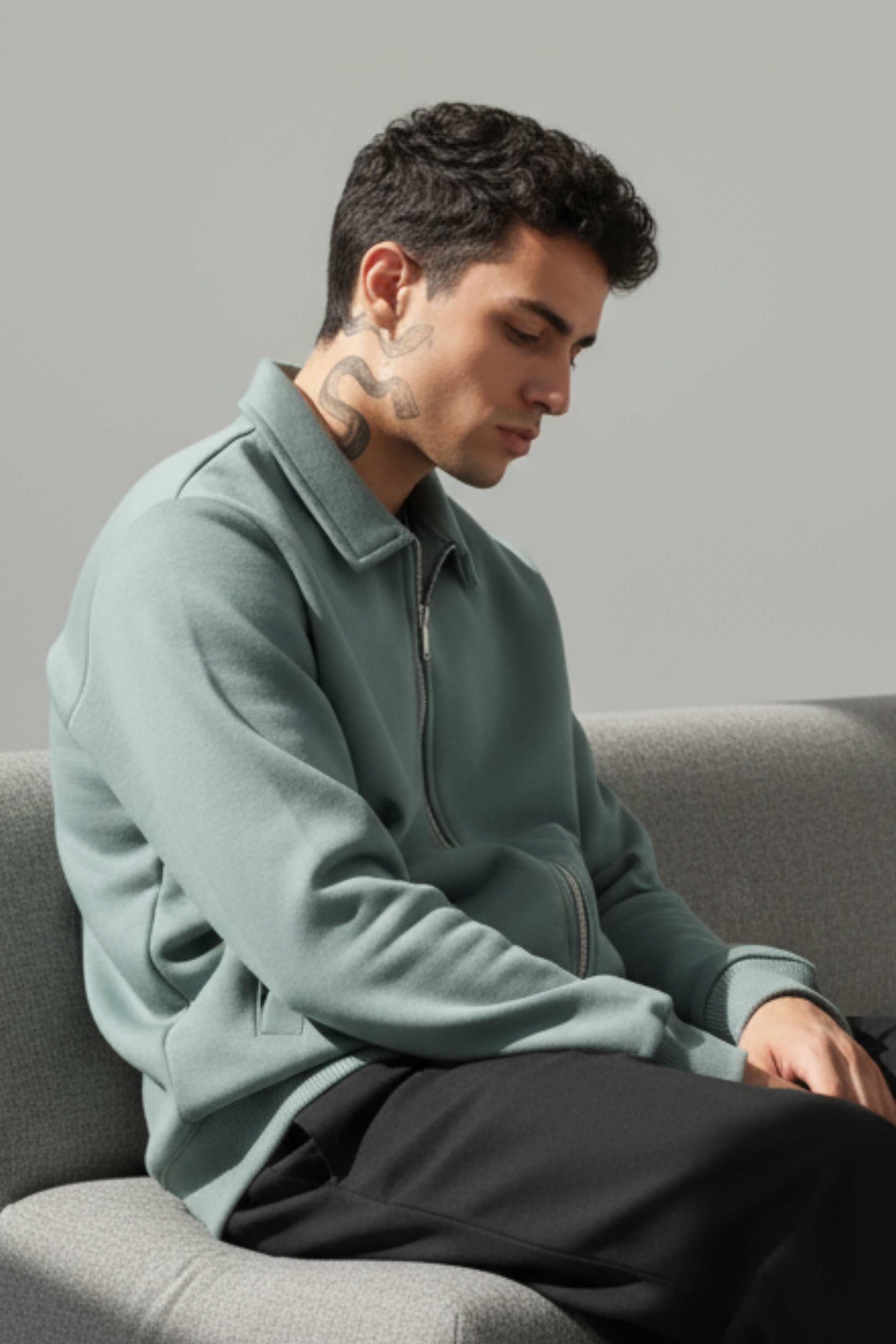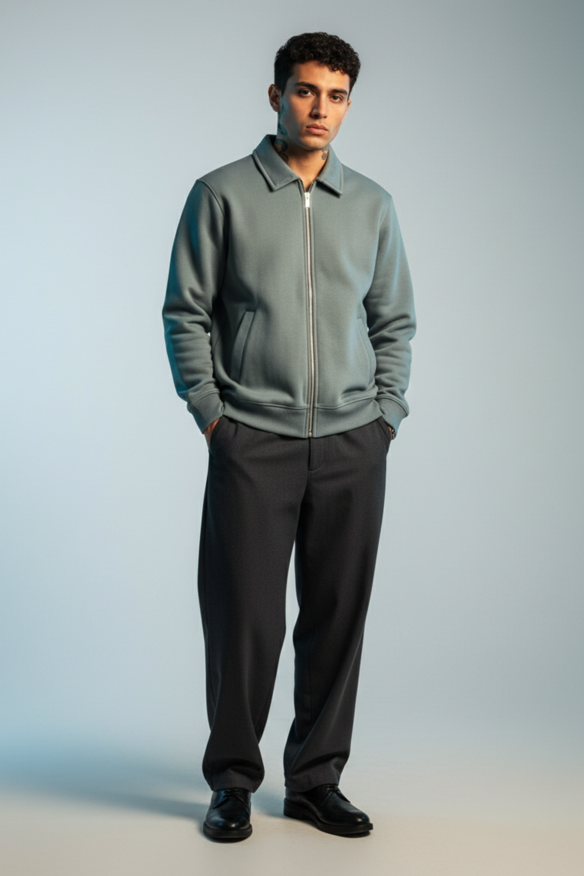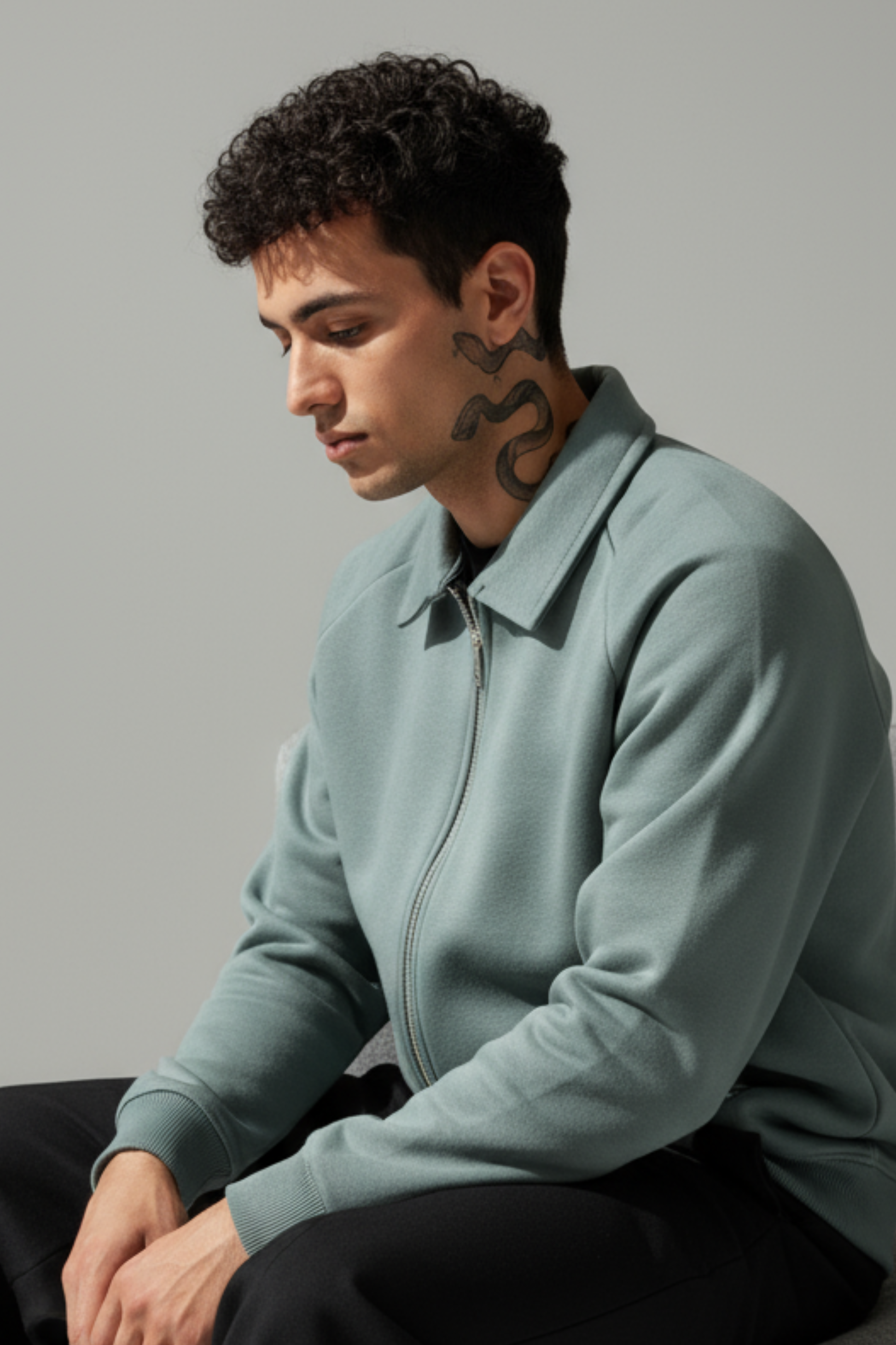 100% cotton, heavyweight 3-thread fleece, 350 GSM,Structured collared zip jacket with a calm, minimal aesthetic