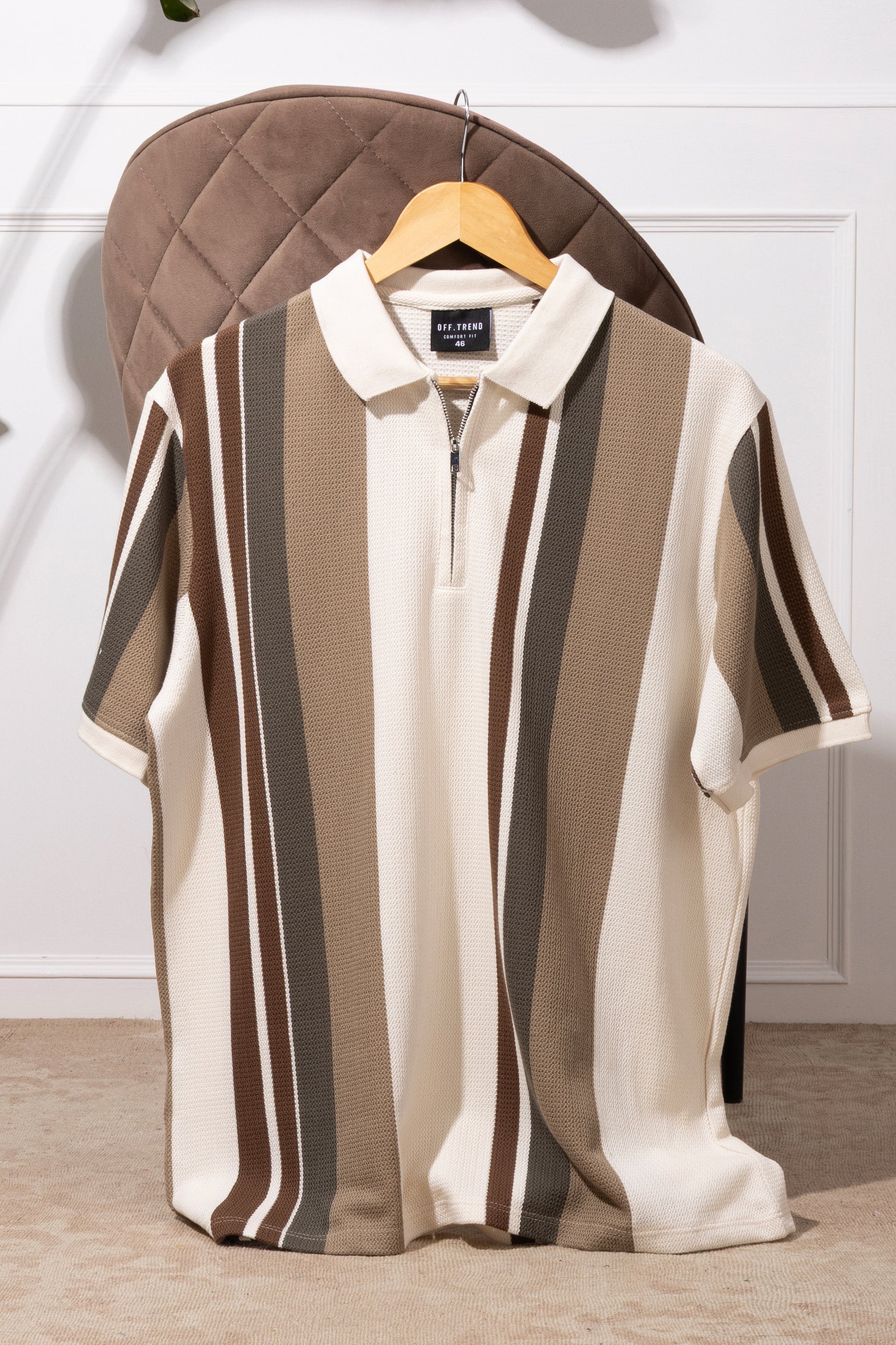This half-zip polo, made from Autostriper Jacquard fabric, delivers a luxurious texture that feels as good as it looks. The vertical stripe pattern in earthy hues—rich browns, soft creams, and deep olive—channels effortless European charm, reminiscent of retro coastal getaways and vintage sportswear icons.